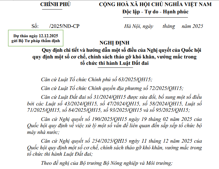 Chính vì vậy, Bộ Tư pháp đã công bố Tài liệu thẩm định dự thảo Nghị định quy định chi tiết và hướng dẫn một số điều của Nghị quyết của Quốc hội quy định một số cơ chế, chính sách tháo gỡ khó khăn, vướng mắc trong tổ chức thi hành Luật Đất đai nhằm "đảm bảo tính thống nhất, minh bạch, phản ánh sát giá thị trường, đồng thời giải quyết vướng mắc trong công tác định giá, thu tiền sử dụng đất và khai thác quỹ đất hiệu quả".