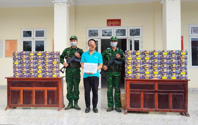 Đối tượng Nguyễn.Đ.H và tang vật là 70 hộp pháo hoa nổ với tổng trọng lượng 144 kg tại Đồn Biên phòng Cửa khẩu Hoàng Diệu.