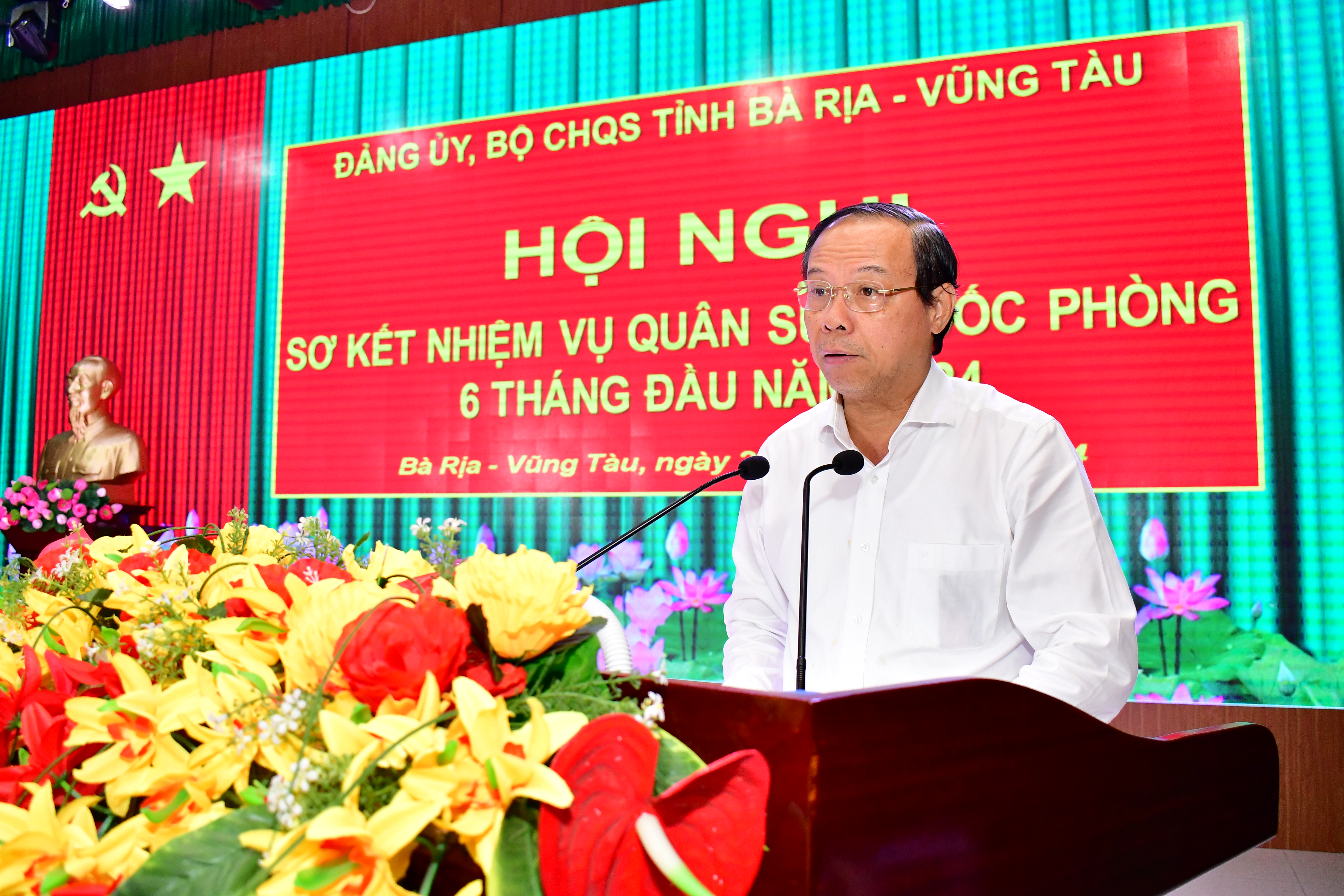 Phát biểu tại hội nghị, đồng chí Nguyễn Văn Thọ, Phó Bí thư Tỉnh ủy, Chủ tịch UBND tỉnh Bà Rịa – Vũng Tàu biểu dương những kết quả đạt được của LLVT tỉnh Bà Rịa – Vũng Tàu trong thời gian qua. Đồng thời đề nghị Đảng ủy, Bộ CHQS tỉnh tiếp tục tập trung lãnh đạo, chỉ đạo hoàn thành tốt các chỉ tiêu, nhiệm vụ năm 2024. Phối hợp chặt chẽ với các lực lượng nắm chắc tình hình, tham mưu cho Tỉnh ủy, UBND tỉnh chỉ đạo kịp thời, không để bị động bất ngờ, giữ vững ổn định an ninh chính trị, trật tự an toàn xã hội góp phần phát triển kinh tế - xã hội địa phương. Tham mưu thực hiện tốt các bước, quy trình tuyển quân năm 2025; xây dựng nền quốc phòng toàn dân, khu vực phòng thủ tỉnh ngày càng vững chắc; tổ chức chặt chẽ diễn tập khu vực phòng thủ và bồi dưỡng kiến thức quốc phòng an ninh cho các đối tượng. Phối hợp với các địa phương làm tốt công tác tuyên truyền cho chủ phương tiện, người dân chấp hành nghiêm pháp luật, không vi phạm vùng biển nước ngoài trong quá trình khai thác hải sản. Đồng thời tham mưu tổ chức tốt hoạt động kỷ niệm các ngày lễ lớn của đất nước, Quân đội; thực hiện hiệu quả các mô hình của Quân khu và địa phương; góp phần thực hiện tốt nhiệm vụ quân sự quốc phòng năm 2024.