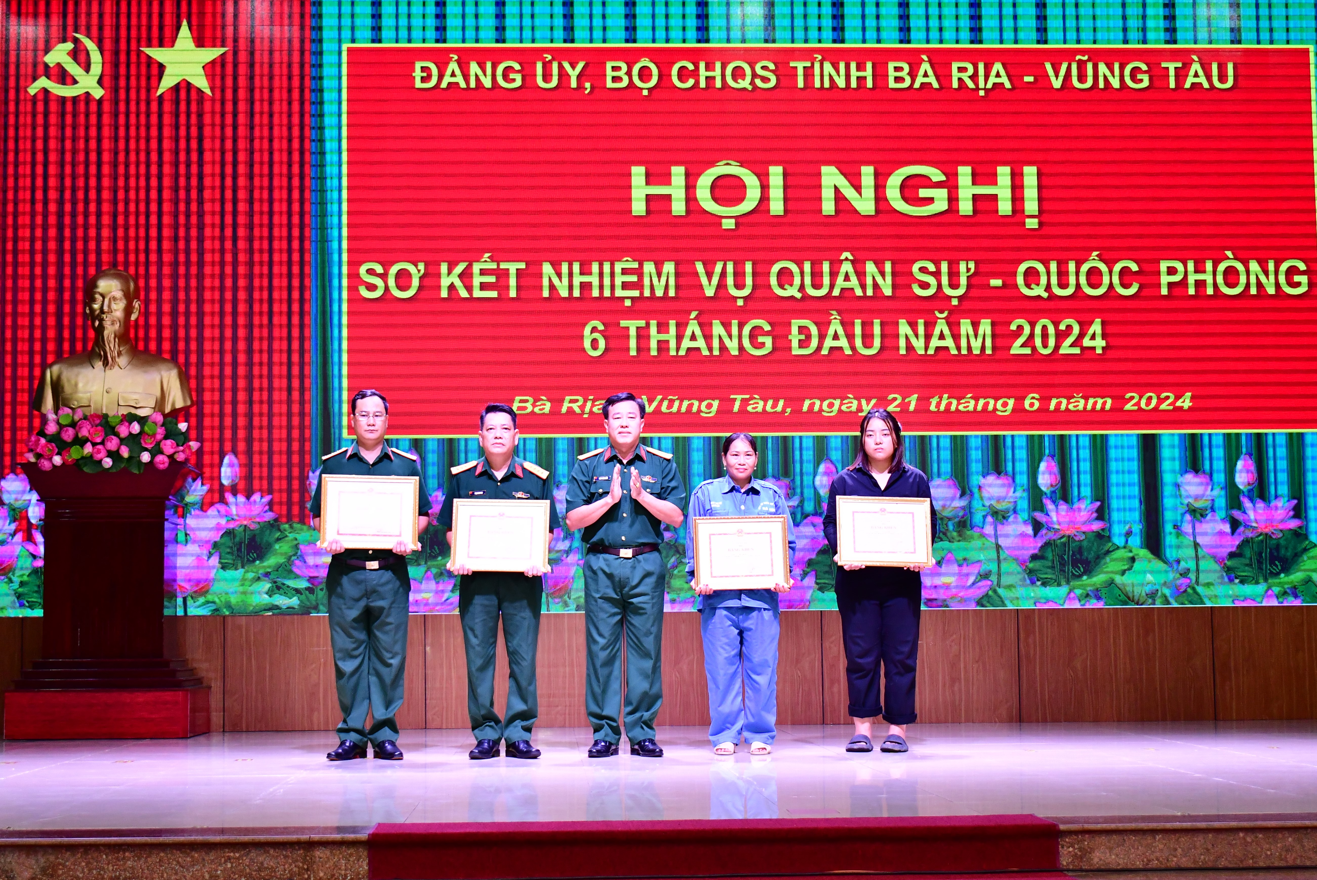 Tại hội nghị, Bộ CHQS tỉnh đã công bố quyết định của Bộ Tư lệnh Quân khu tặng bằng khen cho 2 tập thể thuộc Hội đồng NVQS tỉnh Bà Rịa – Vũng Tàu có thành tích xuất sắc trong công tác tuyển chọn, gọi công dân nhập ngũ năm 2024 và 2 hộ gia đình tiêu biểu gương mẫu trong thực hiện NVQS năm 2024. Bộ CHQS tỉnh tặng giấy khen cho 60 cá nhân có thành tích xuất sắc trong tham gia hội thi, hội thao do Bộ Quốc phòng và Quân khu tổ chức.
