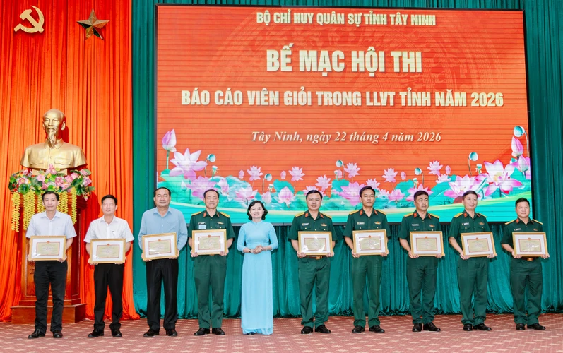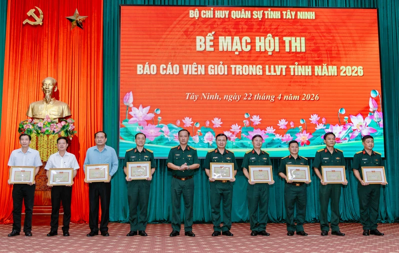 Bộ CHQS tỉnh Tây Ninh đã tặng giấy khen cho các tập thể, cá nhân có thành tích xuất sắc; trao giấy chứng nhận “Báo cáo viên giỏi” cấp Bộ CHQS tỉnh năm 2026 cho 23 thí sinh có tổng điểm trung bình từ 8,5 trở lên.