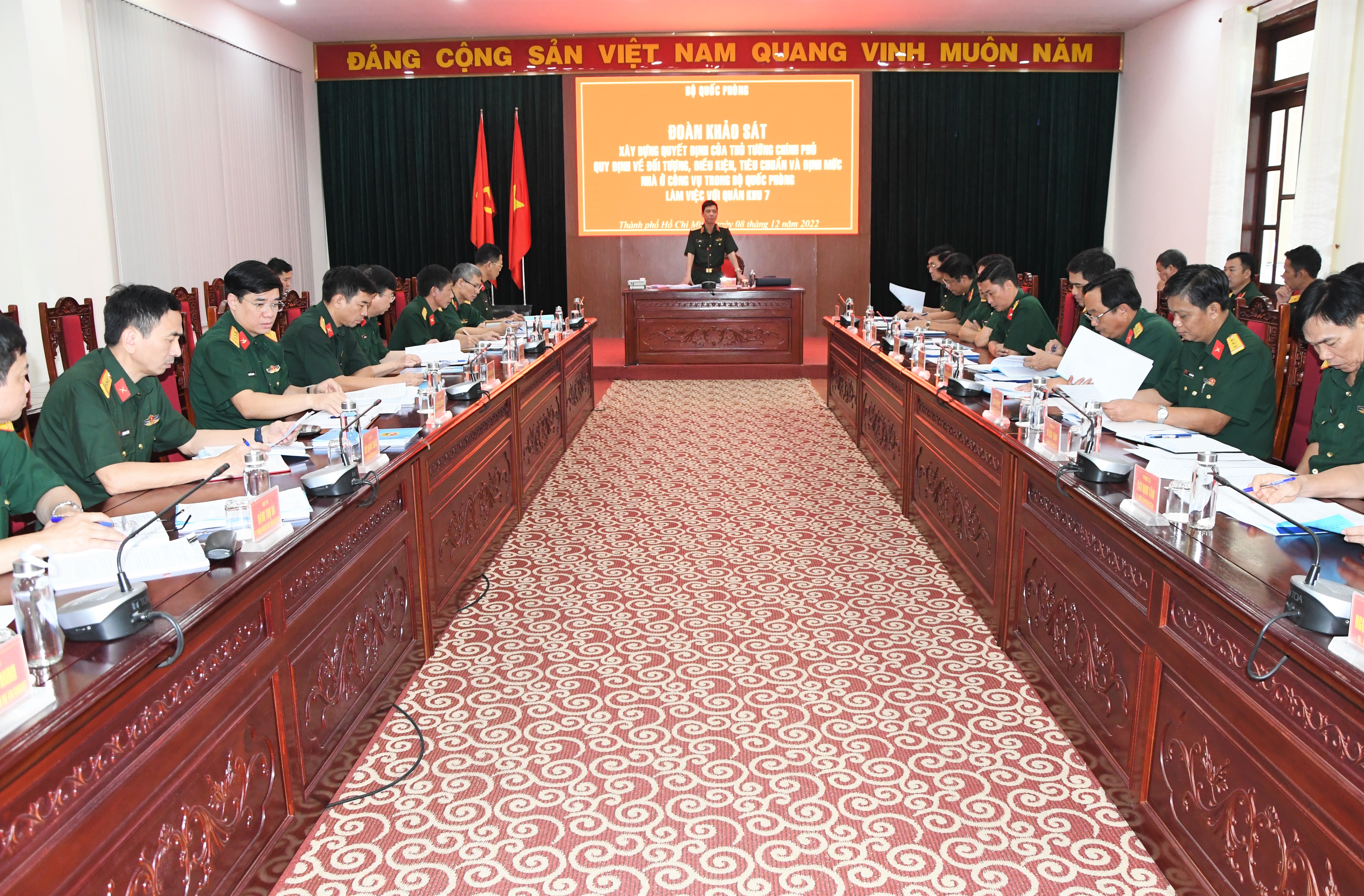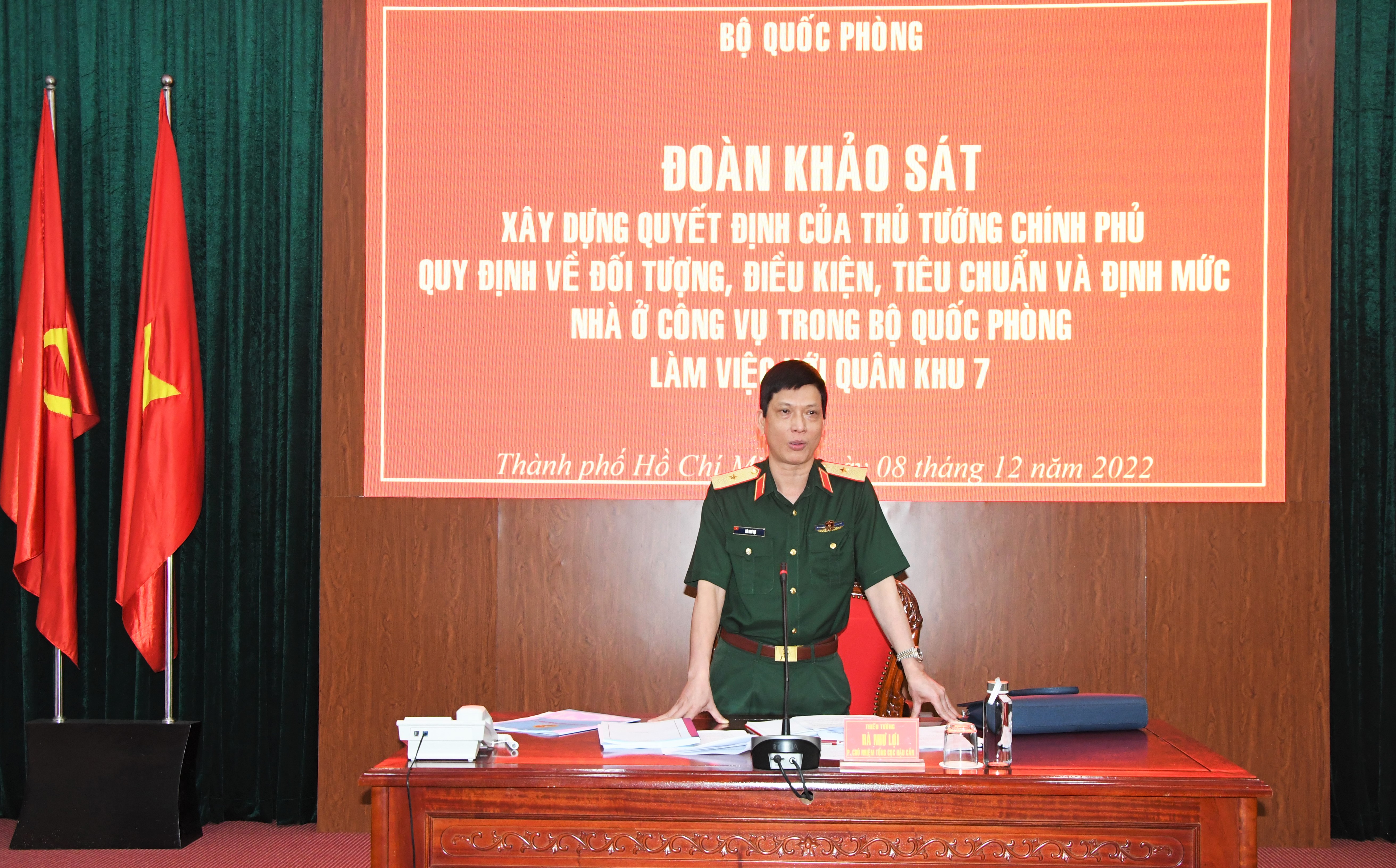 (QK7 Online) - Ngày 8/12 Đoàn khảo sát Bộ Quốc phòng do Thiếu tướng Hà Như Lợi, Phó Chủ nhiệm Tổng Cục Hậu cần làm Trưởng đoàn tiến hành khảo sát phục vụ xây dựng quyết định của Thủ tướng Chính phủ quy định về đối tượng, điều kiện, tiêu chuẩn và định mức nhà ở công vụ trong Bộ Quốc phòng. Tham gia đoàn có Thiếu tướng Võ Văn Thi, Phó Tư lệnh Quân khu 7 và các cơ quan chức năng của Quân khu 7.