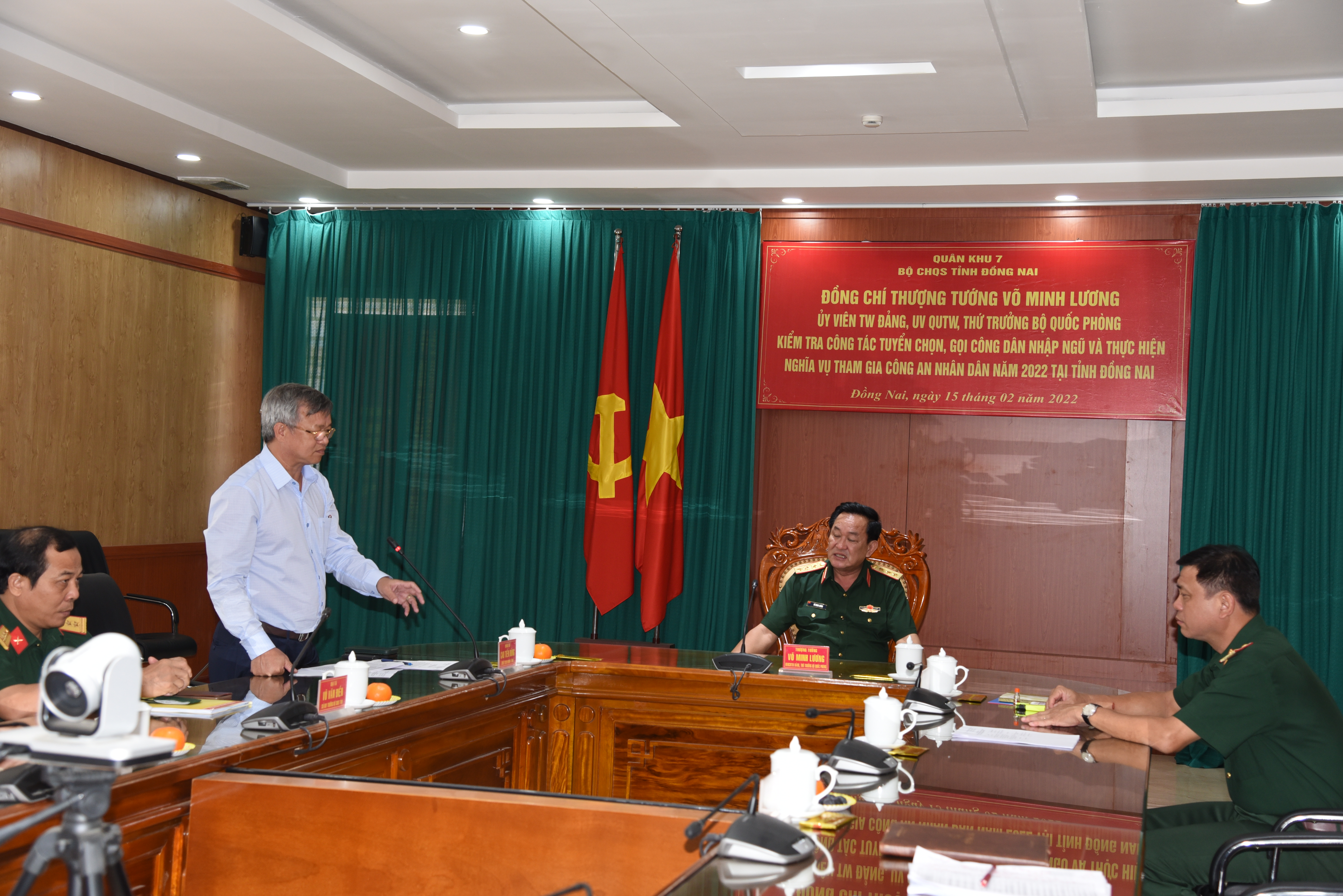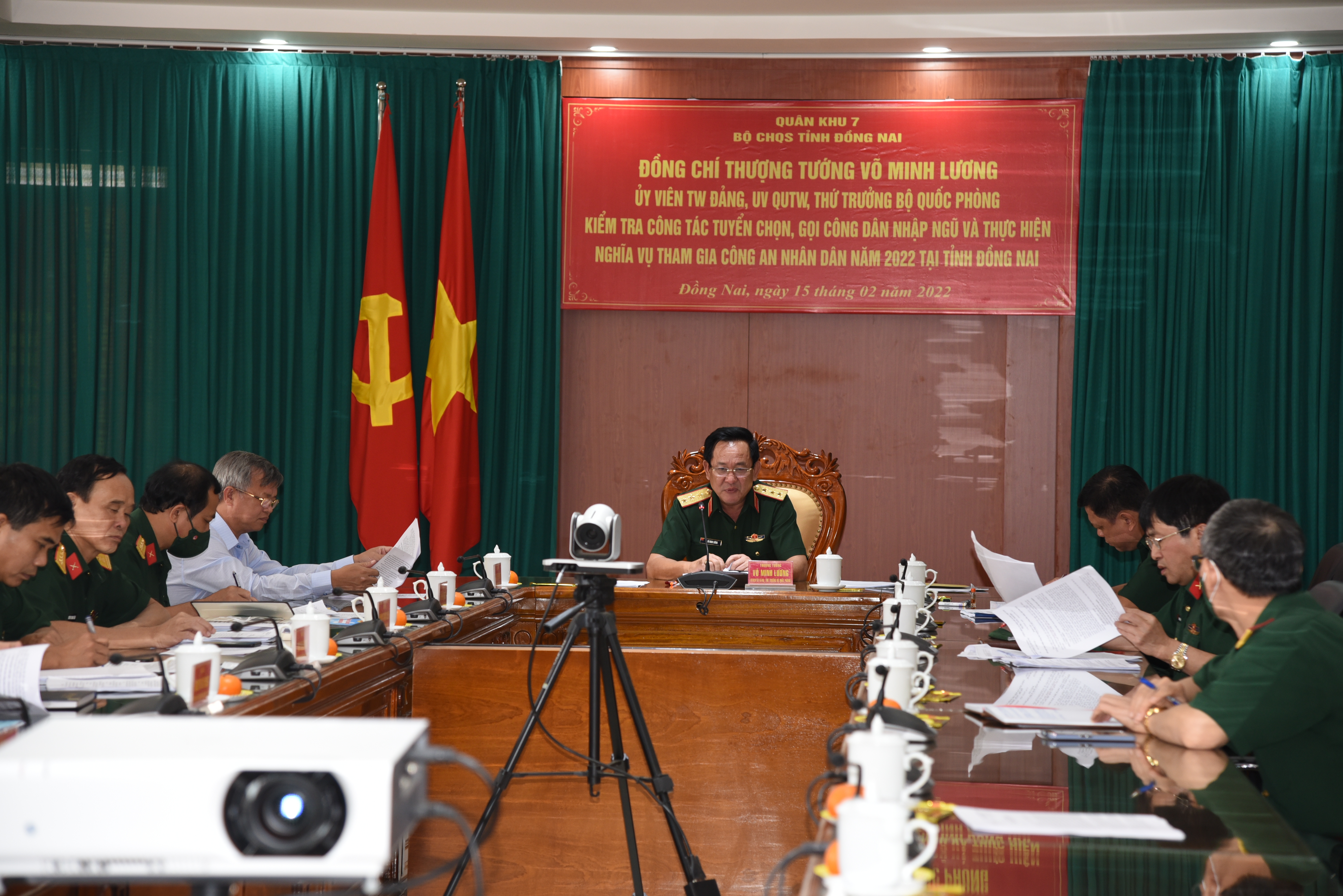 Kết luận buổi kiểm tra, Thượng tướng Võ Minh Lương, Thứ trưởng Bộ Quốc phòng đánh giá cao công tác chuẩn bị gọi công dân nhập ngũ của tỉnh Đồng Nai. Đồng chí đề nghị cần rà soát chặt chẽ hơn nữa chất lượng đầu vào, để thực hiện được mục tiêu xây dựng quân đội cách mạng, chính quy, tinh nhuệ, từng bước hiện đại và hiện đại vào 2030. Năm nay và những năm tiếp theo đề nghị Hội đồng NVQS tỉnh Đồng Nai cần phải tham mưu tốt hơn nữa cho cấp ủy, chính quyền nâng cao chất lượng tuyển quân, nhất là sức khỏe, chính trị, văn hóa. Đồng chí Thứ trưởng lưu ý công tác giao quân phải đảm bảo công tác phòng, chống dịch an toàn.