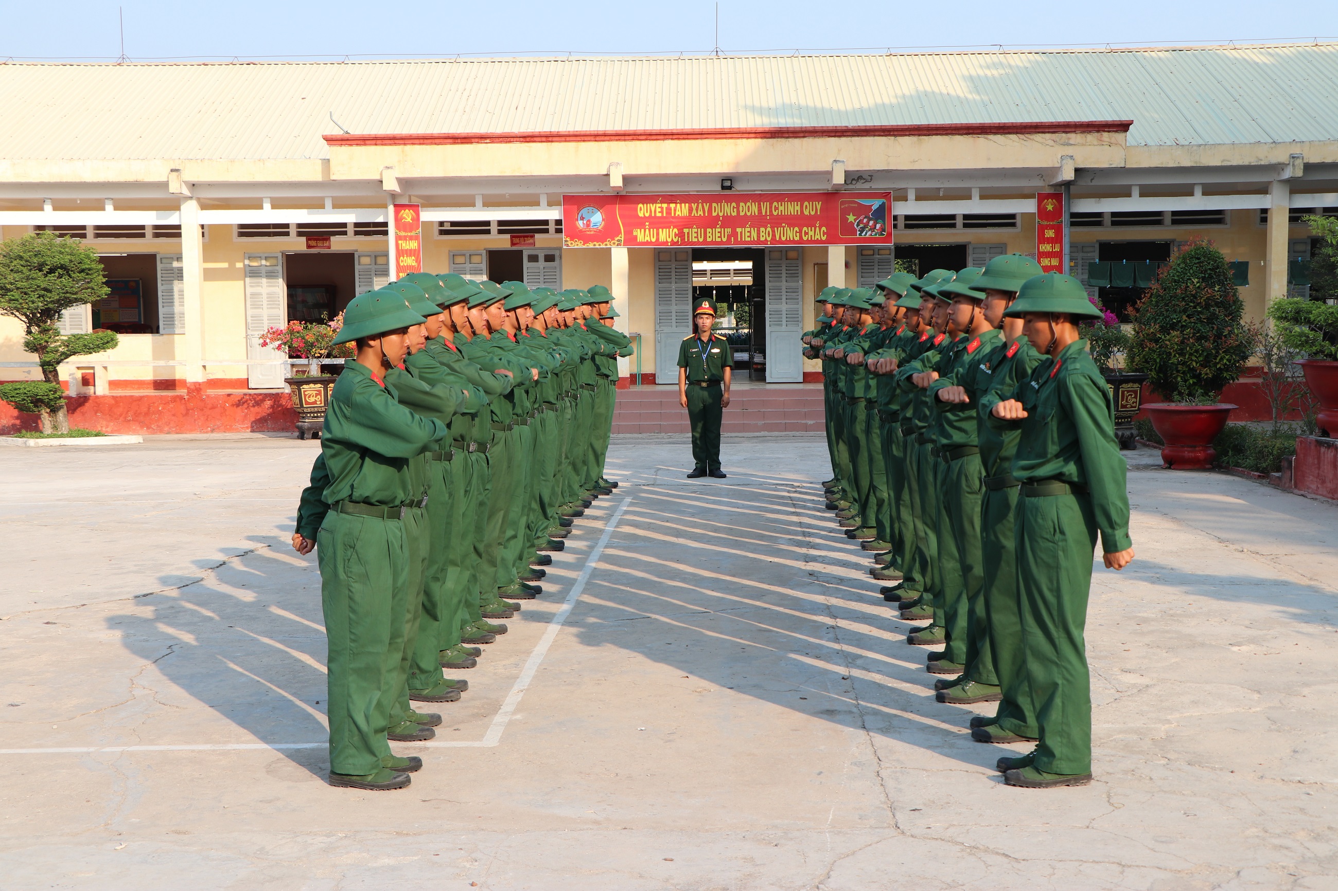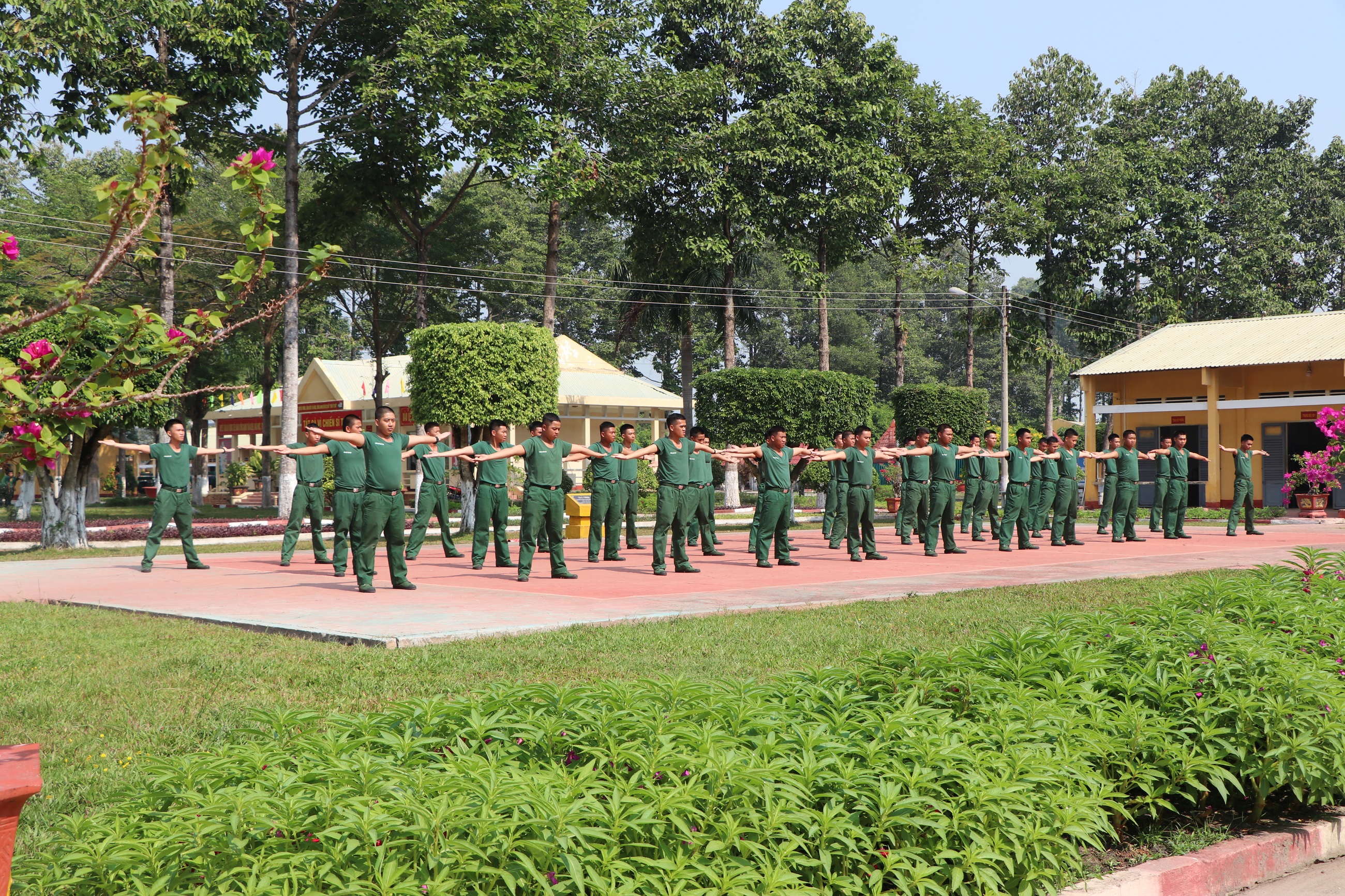 Chiến sĩ mới Tiểu đoàn 2, Trung đoàn 4, Sư đoàn 5 tập các bài thể dục buổi sáng.