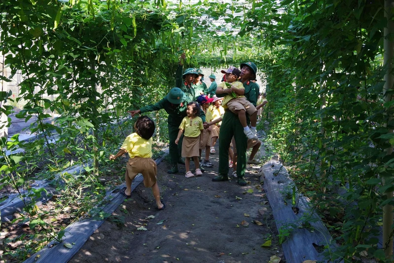 Các cháu thiếu nhi cùng chiến sĩ tham quan vườn tăng gia Tiểu đoàn 14.