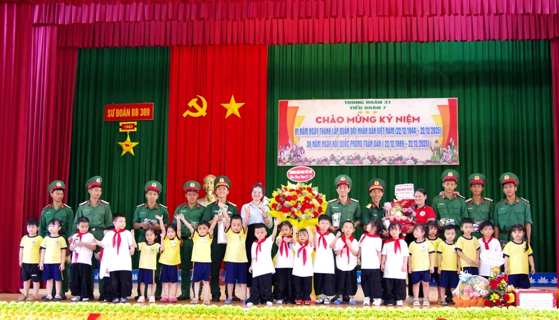 (QK7 Online) - Nhân kỷ niệm 81 năm Ngày thành lập Quân đội nhân dân Việt Nam (22/12/1944 - 22/12/2025), ngày 17/12, Tiểu đoàn 14 (Trung đoàn 174, Bộ CHQS tỉnh Tây Ninh) phối hợp với Trường Mầm non Hoa Sen tổ chức chương trình giao lưu, trải nghiệm thực tế cho hơn 100 cháu thiếu nhi của nhà trường tại đơn vị. Tham dự chương trình có Trung tá Vũ Trường Trung, Chính ủy Trung đoàn 174; Cô Lê Thị Hải Diễm, Hiệu trưởng Trường mầm non Hoa Sen.