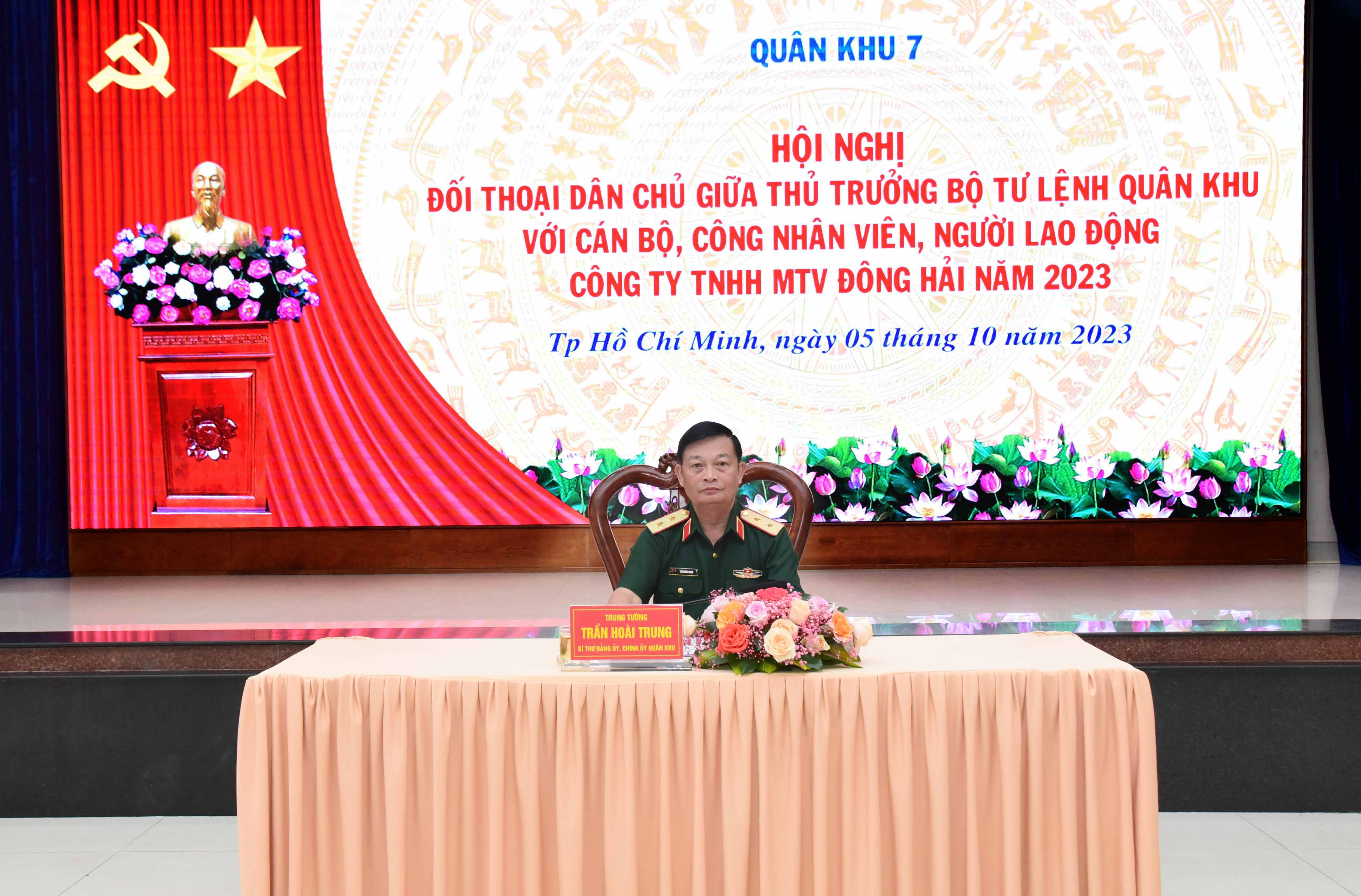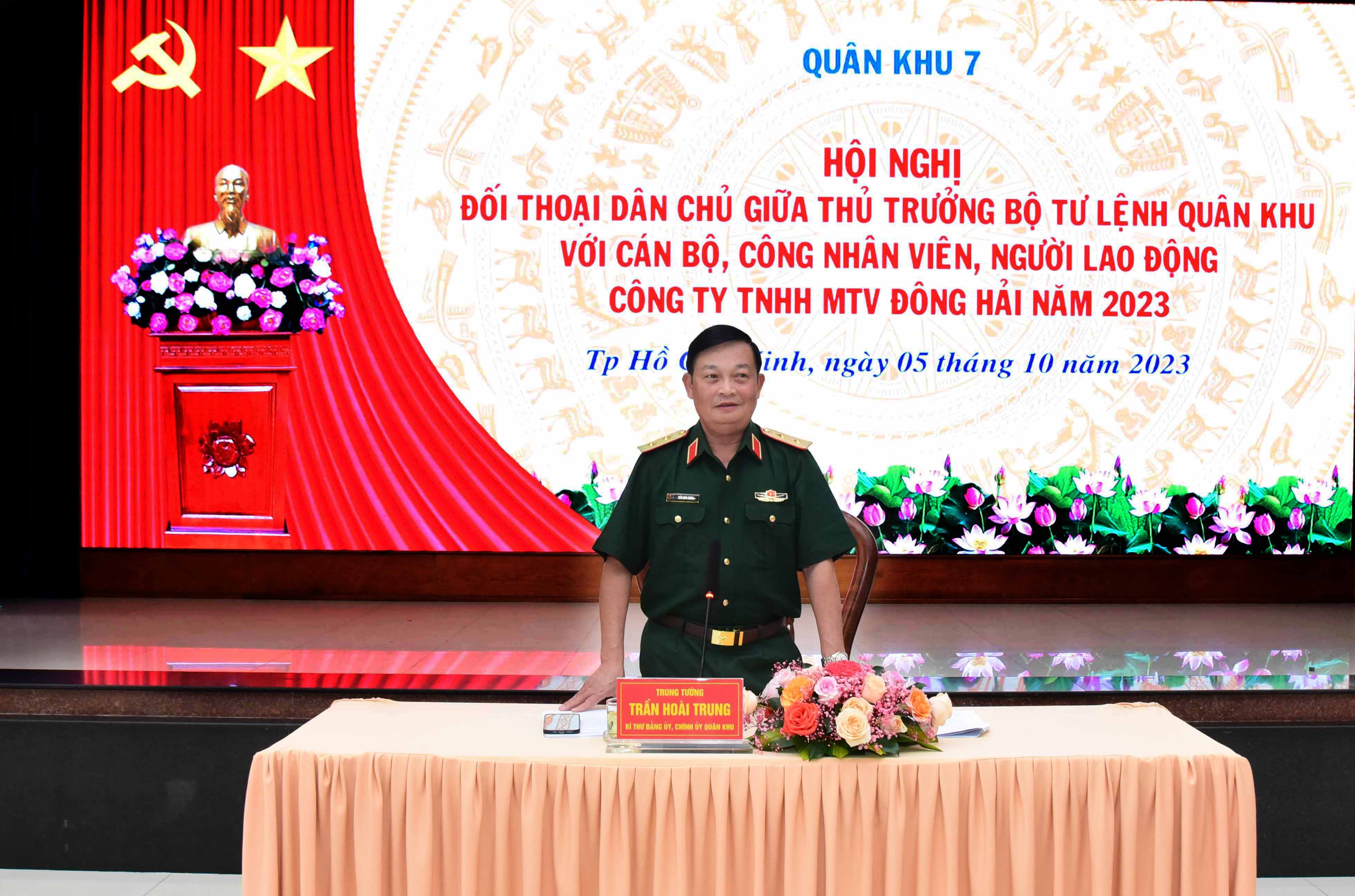 (QK7 Online) - Sáng 5-10, Trung tướng Trần Hoài Trung, Bí thư Đảng ủy, Chính ủy Quân khu chủ trì đối thoại dân chủ giữa thủ trưởng Bộ Tư lệnh Quân khu với cán bộ, công nhân viên, người lao động Công ty TNHH MTV Đông Hải. Cùng dự có thủ trưởng các cơ quan Quân khu.
