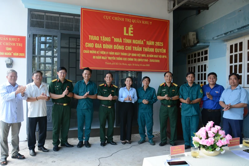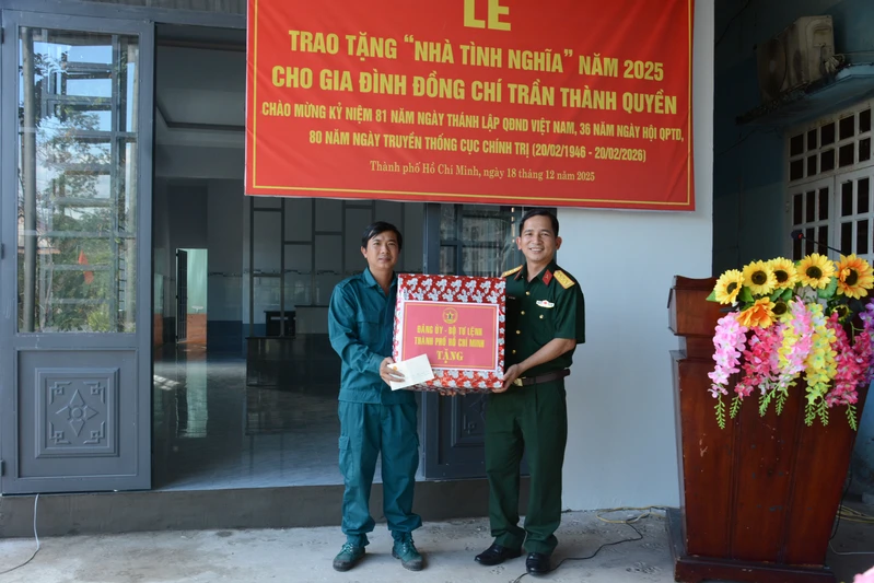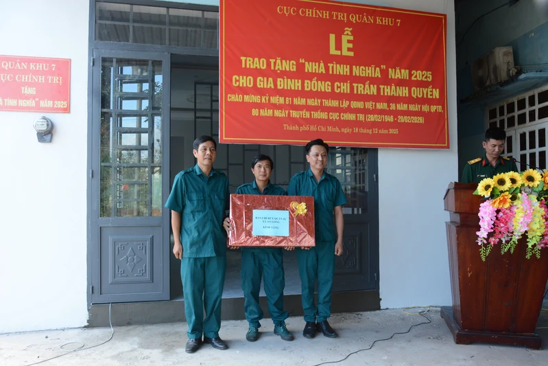 (QK7 Online) - Nằm trong chuỗi hoạt động thiết thực chào mừng 81 năm Ngày thành lập Quân đội Nhân dân Việt Nam (22/12/1944 – 22/12/2025), 36 năm Ngày hội Quốc phòng toàn dân (22/12/1989 – 22/12/2025) và hướng tới 80 năm Ngày truyền thống Cục Chính trị (20/02/1946 – 20/02/2026), chiều ngày 18/12, Cục Chính trị Quân khu tổ chức bàn giao “Nhà tình nghĩa” cho gia đình đồng chí Trần Thành Quyền, chiến sĩ dân quân tự vệ Ban CHQS xã An Long, thường trú tại tổ 19, ấp 9, xã An Long, TP. Hồ Chí Minh.