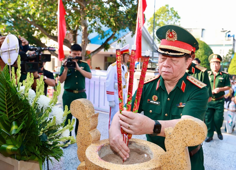 Đại tướng Nguyễn Trọng Nghĩa, Ủy viên Bộ Chính trị, Bí thư Trung ương Đảng, Chủ nhiệm Tổng cục Chính trị (thứ 4 bên phải); các đồng chí lãnh đạo Bộ Quốc phòng, Quân khu 7, tỉnh Tây Ninh và đại biểu thực hiện nghi thức dâng hoa, dâng hương tưởng niệm, tri ân các anh hùng liệt sĩ.