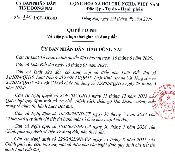 UBND tỉnh Đồng Nai đã ban hành Quyết định số 1454/QĐ-UBND về việc gia hạn thời gian đưa đất vào sử dụng cho Công ty TNHH Berjaya - D2D. Đây là lần gia hạn cuối cùng đối với phần đất 11.628,9 m² thuộc dự án Khu phức hợp và Khách sạn 5 sao tại phường Trấn Biên, TP. Biên Hòa. Thời hạn gia hạn kéo dài 3 tháng, tính từ ngày ký quyết định.