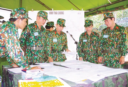 Thượng tá Lê Xuân Bình, Sư đoàn trưởng Sư đoàn 5 (thứ 2 từ trái qua) kiểm tra phương án tác chiến trong diễn tập.