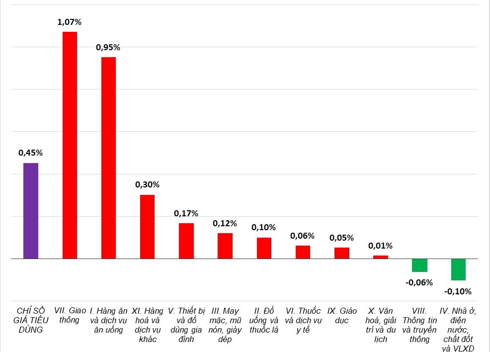 - Nhóm giao thông tăng 1,07%, trong đó, chỉ số giá dầu diesel tăng 5,23%; chỉ số giá xăng tăng 2,41% do ảnh hưởng của các đợt điều chỉnh giá xăng dầu trong nước. Thêm vào đó, giá xe máy tăng 0,03%; phụ tùng ô tô tăng 0,29%. Giá vận tải hành khách bằng đường hàng không tăng 3,61%; vận tải hành khách kết hợp tăng 0,57% do nhu cầu đi lại tăng,..