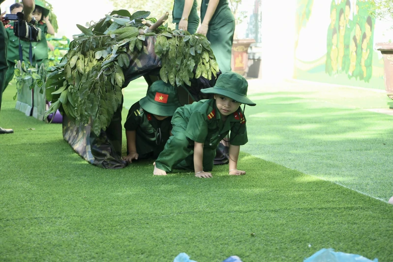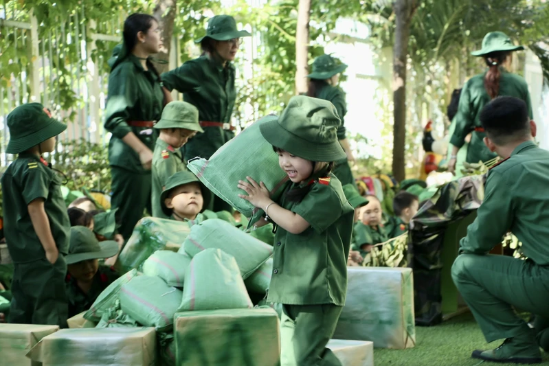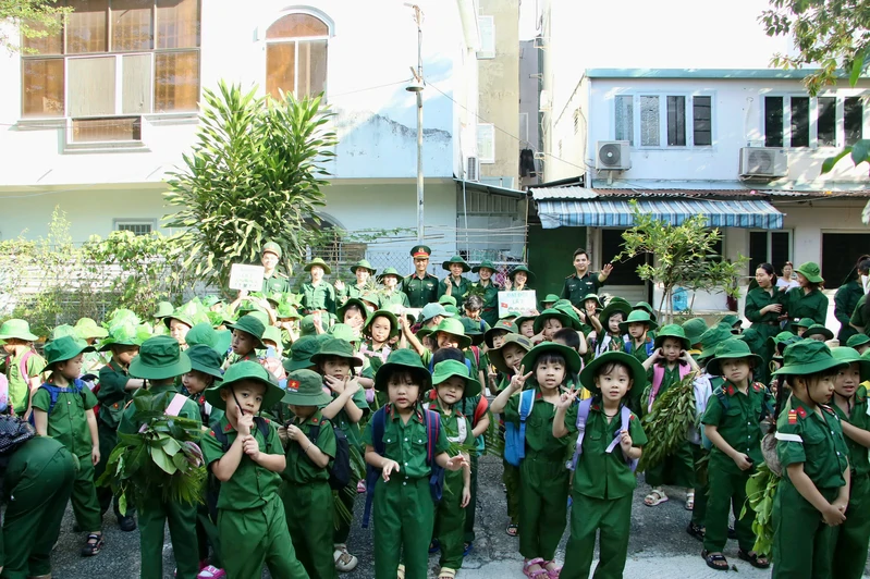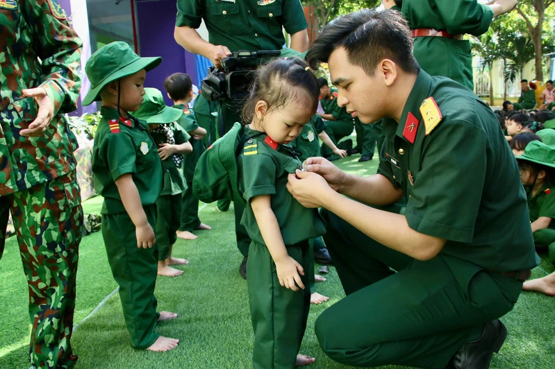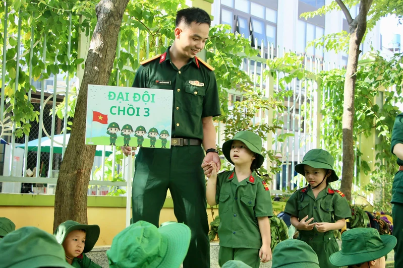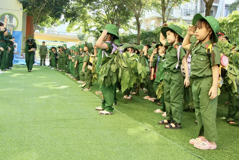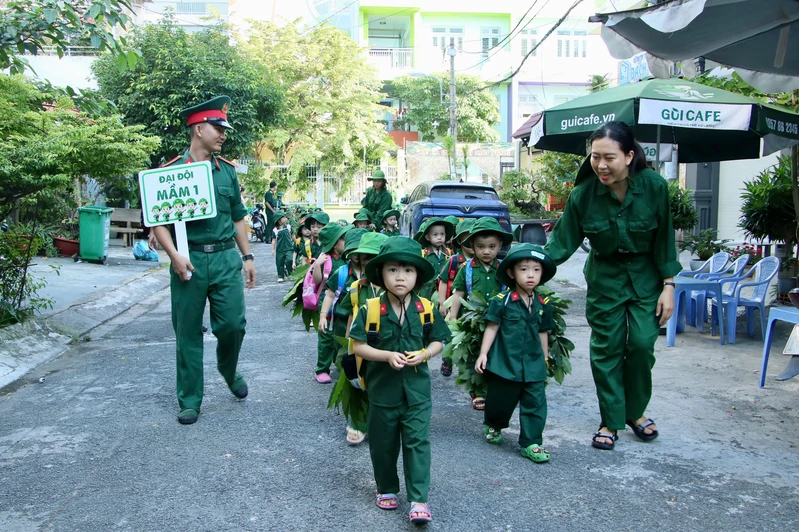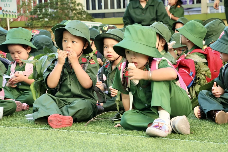 Từ sáng sớm, khuôn viên nhà trường đã rộn ràng với hình ảnh những “chiến sĩ nhí” trong trang phục bộ đội, đội mũ tai bèo. Dưới sự hướng dẫn của giáo viên, trẻ được chia thành các tiểu đội, trung đội, tham gia khởi động bằng những ca khúc vui tươi, phấn khởi.