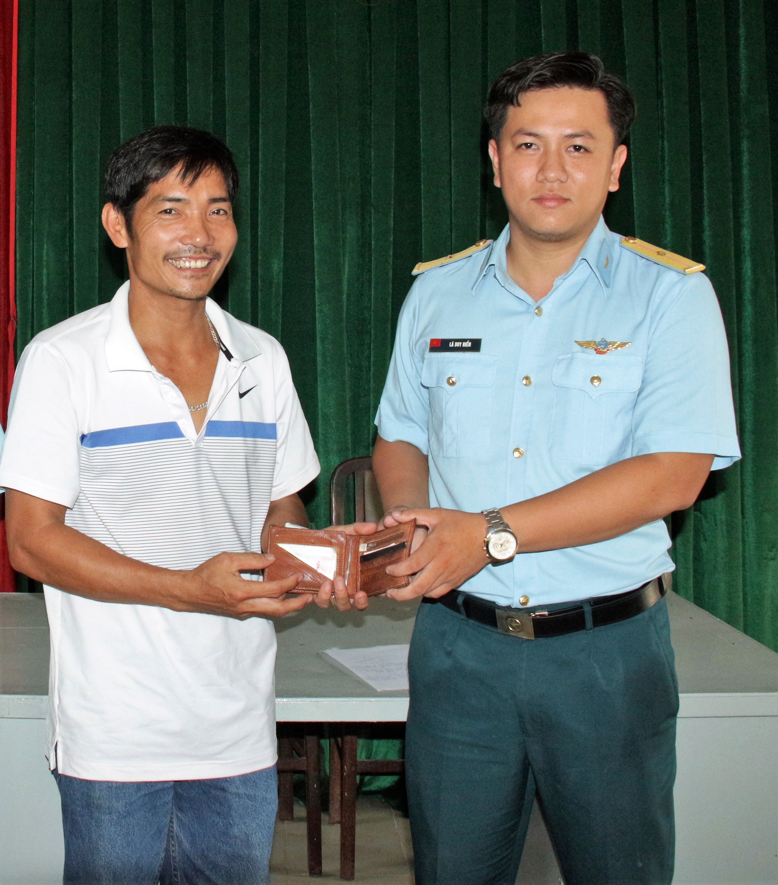 (QK7 Online) - Khoảng 10 giờ ngày 30/5, trên đường về đơn vị, Thiếu úy QNCN Lã Duy Hiển, nhân viên Phòng cháy chữa cháy Đại đội Xe máy - Xăng dầu - Phòng cháy chữa cháy, Tiểu đoàn Căn cứ sân bay Tân Sơn Nhất (Sư đoàn Không quân 370) đã nhặt được một chiếc ví cá nhân.