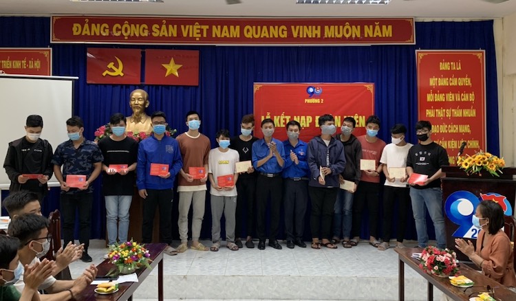 Trong buổi họp mặt, Đoàn phường 2 tổ chức kết nạp Đoàn cho các thanh niên trúng tuyển NVQS – NVCA.