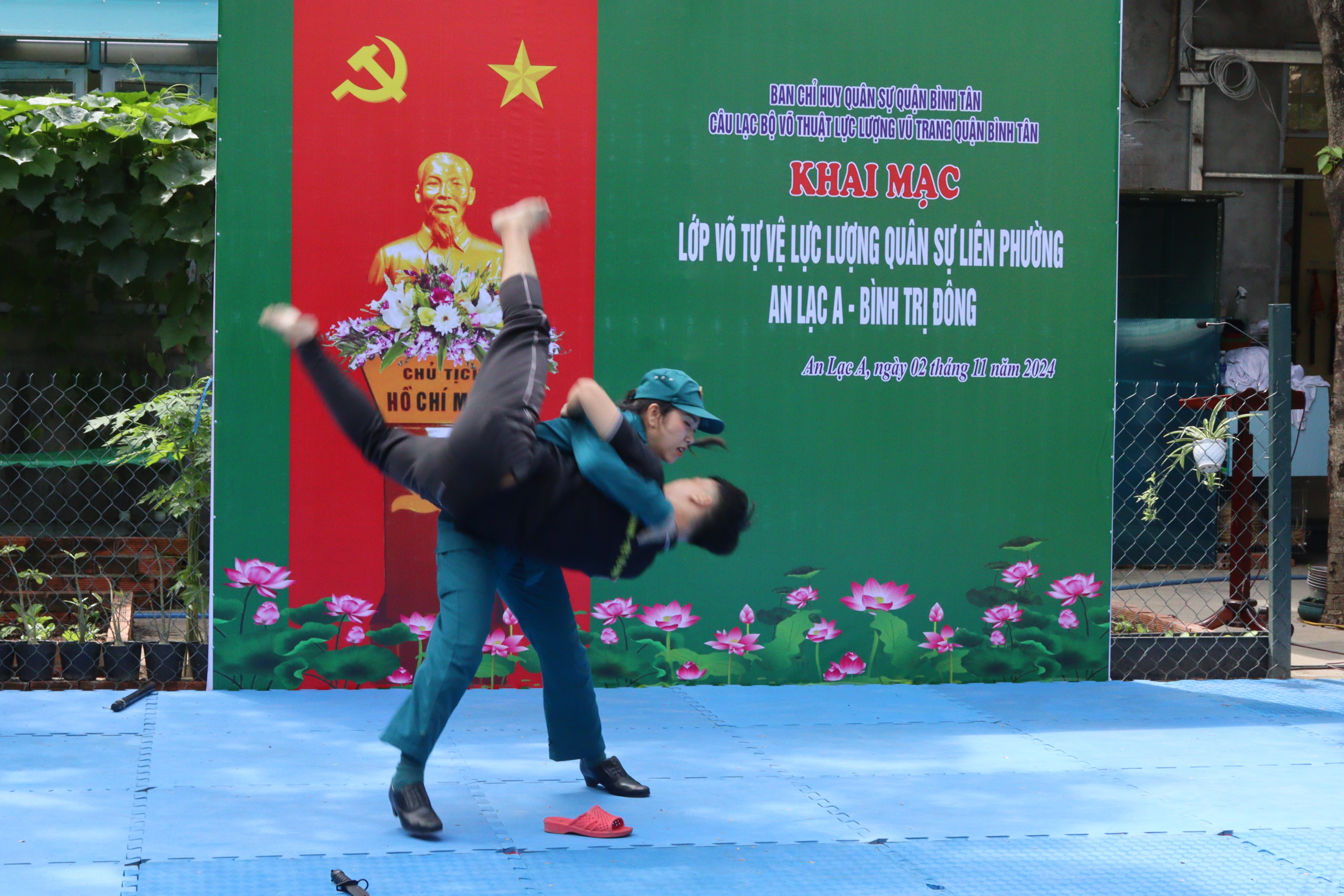 Nữ dân quân tự vệ phường An Lạc A biểu diễn đánh đối kháng tại buổi lễ.