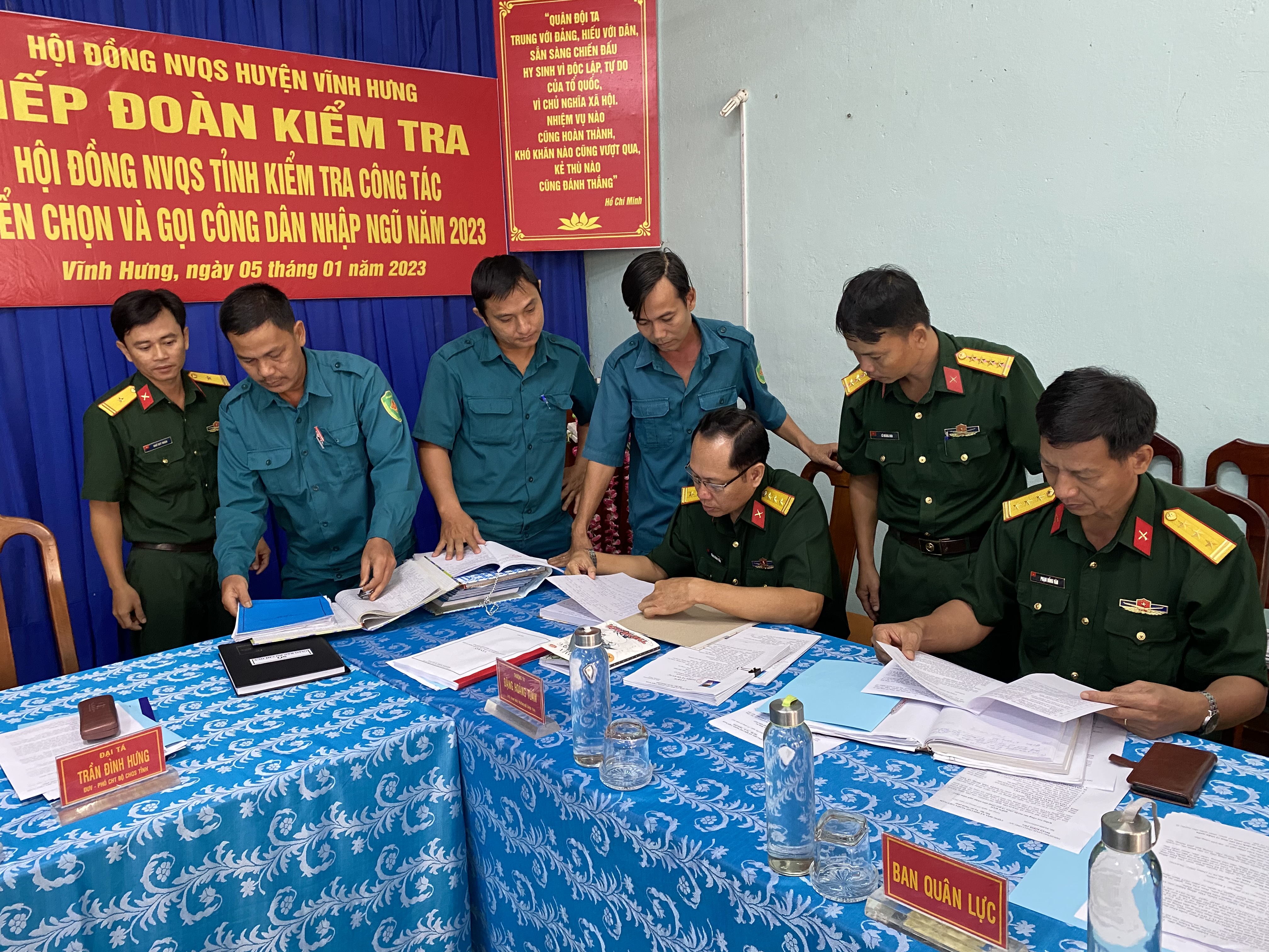 Tại buổi kiểm tra, đoàn công tác nghe cơ quan thường trực Hội đồng NVQS huyện Vĩnh Hưng báo cáo kết quả chuẩn bị tuyển quân năm 2023 tại địa phương đến thời điểm kiểm tra. Để thực hiện tốt nhiệm vụ tuyển chọn và gọi công dân nhập ngũ năm 2023, trước đó, Hội đồng NVQS huyện tập trung lãnh đạo, chỉ đạo các xã, thị trấn thực hiện tốt việc tuyển chọn và gọi công dân nhập ngũ như: công tác đăng ký, quản lý nguồn, tổ chức sơ tuyển, xét duyệt bảo đảm dân chủ, công khai, công bằng, đúng luật. Phối hợp chặt chẽ với các ban, ngành, đoàn thể làm tốt công tác tuyên truyền, giáo dục nâng cao nhận thức cho nhân dân, nhất là thanh niên trong tuổi nghĩa vụ quân sự rõ trách nhiệm, nghĩa vụ và quyền lợi của công dân đối với nhiệm vụ xây dựng và bảo vệ Tổ quốc. Toàn huyện Vĩnh Hưng có 922 thanh niên sẵn sàng nhập ngũ, qua khám tuyển có 209 thanh niên đủ điều kiện nhập ngũ năm 2023.