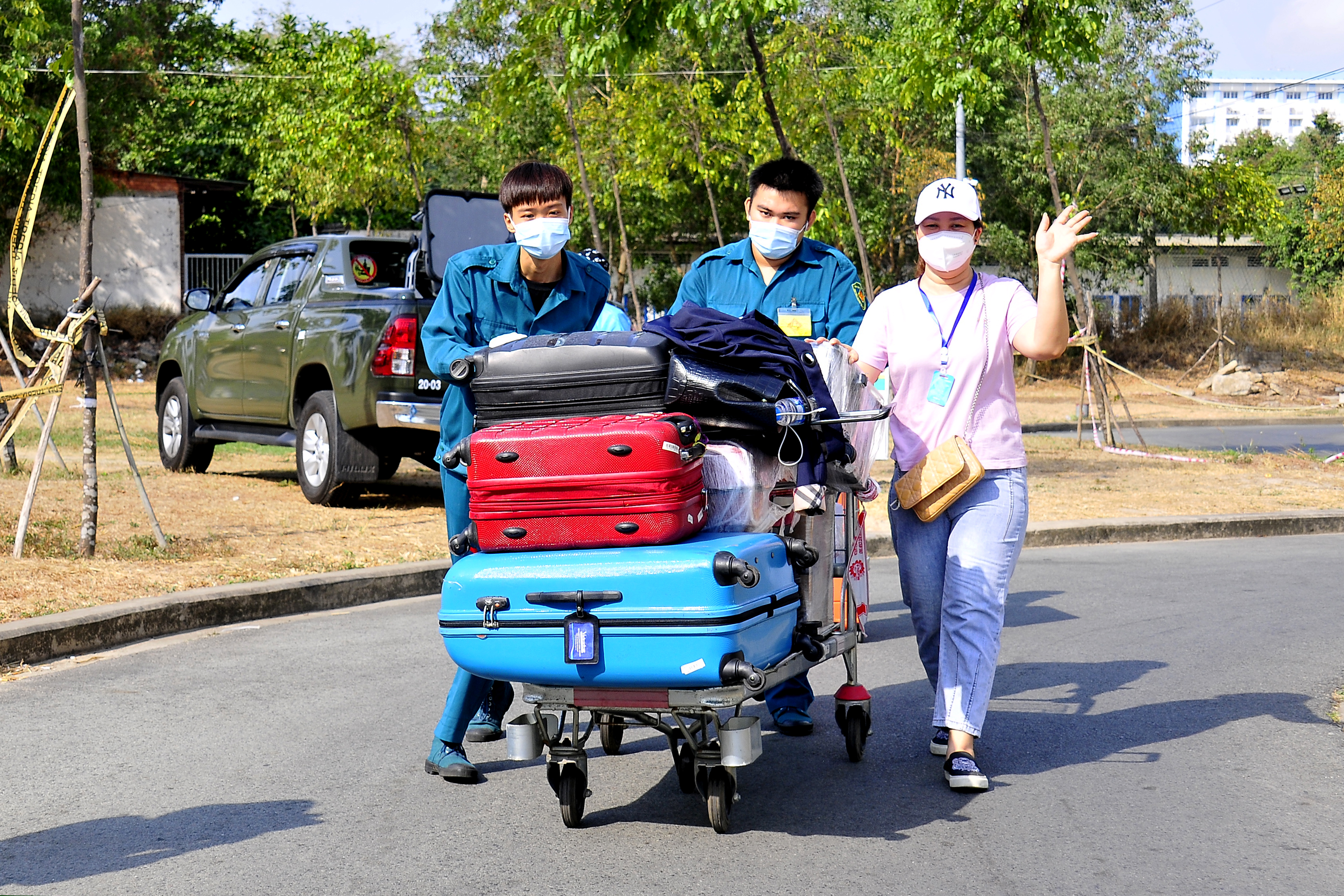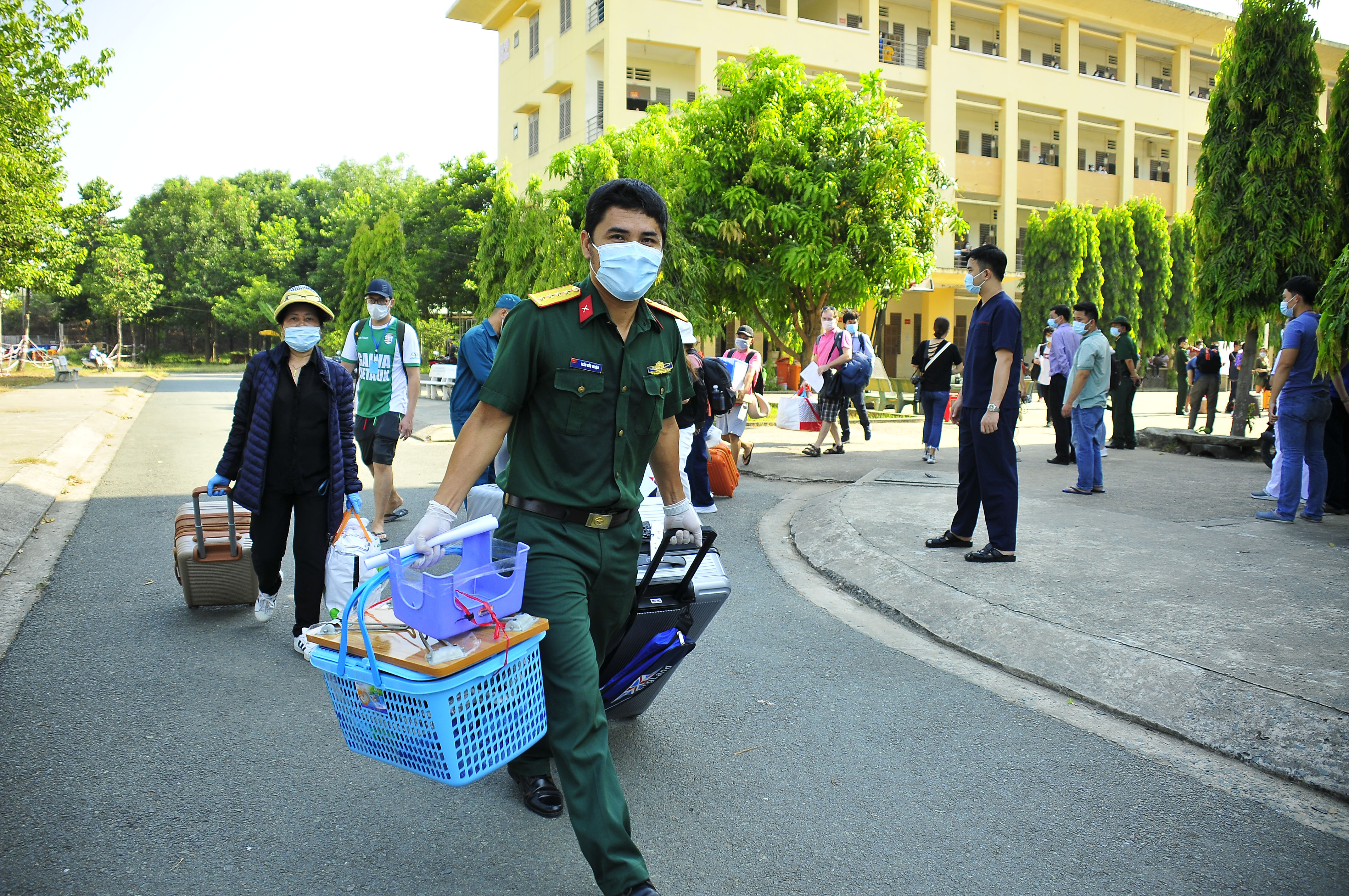 Cán bộ, chiến sĩ LLVT Quân khu 7 hỗ trợ người dân hoàn thành cách ly trở về nhà.