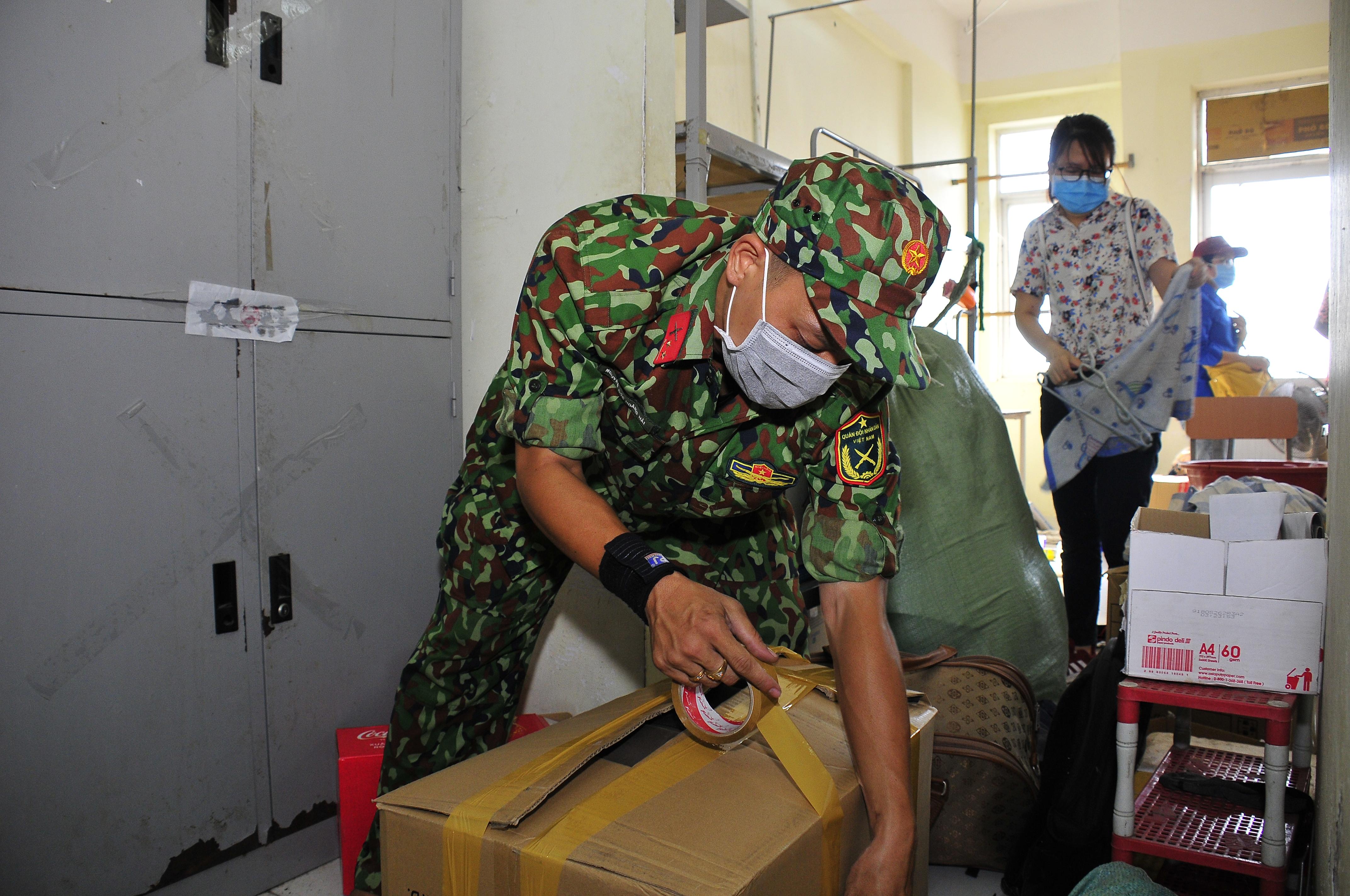 Chiến sĩ Trung đoàn Gia Định thu dọn đồ đạc của sinh viên, chuẩn bị địa điểm đón người dân đến cách ly tại Ký túc xá Đại học Quốc gia TPHCM.