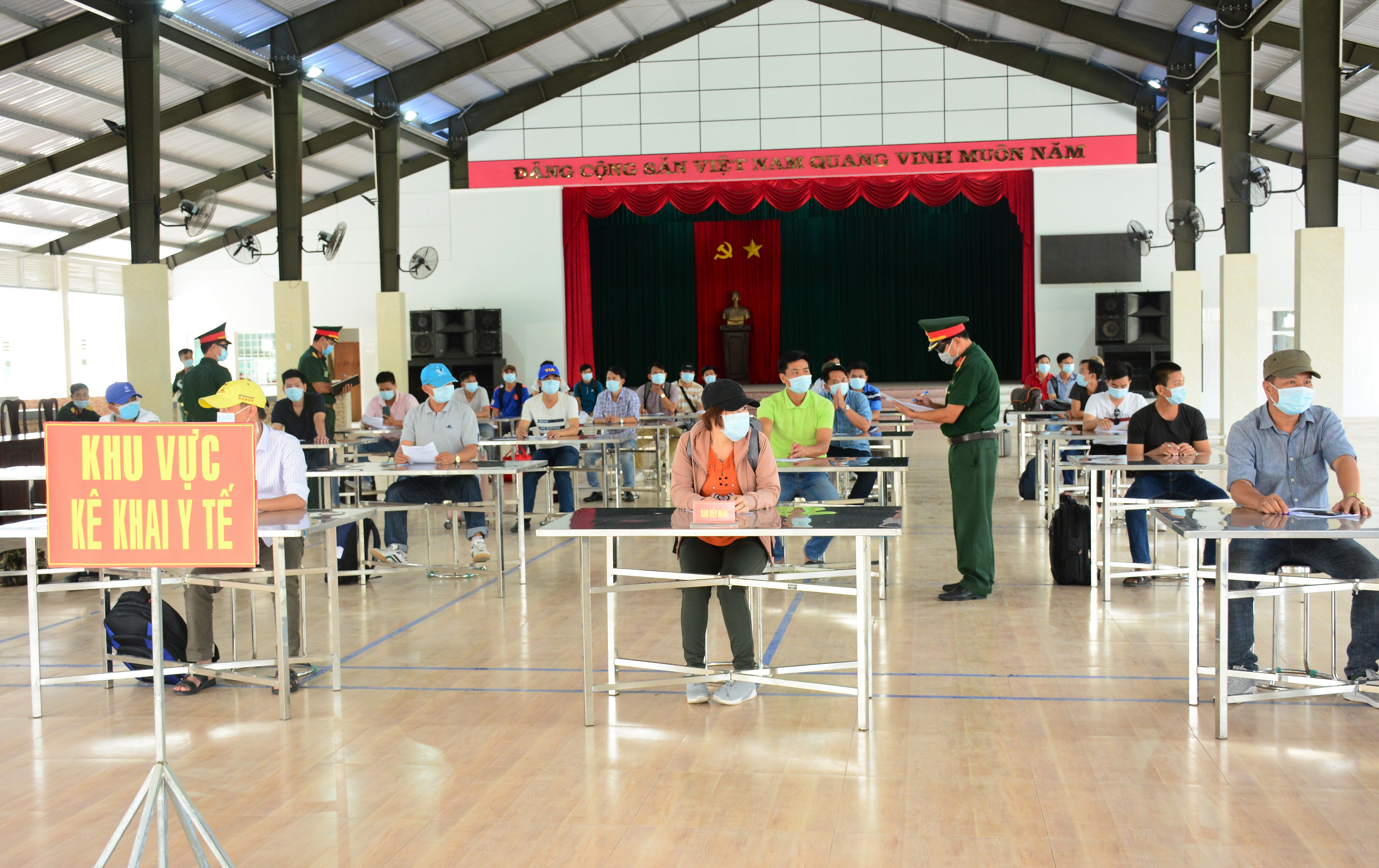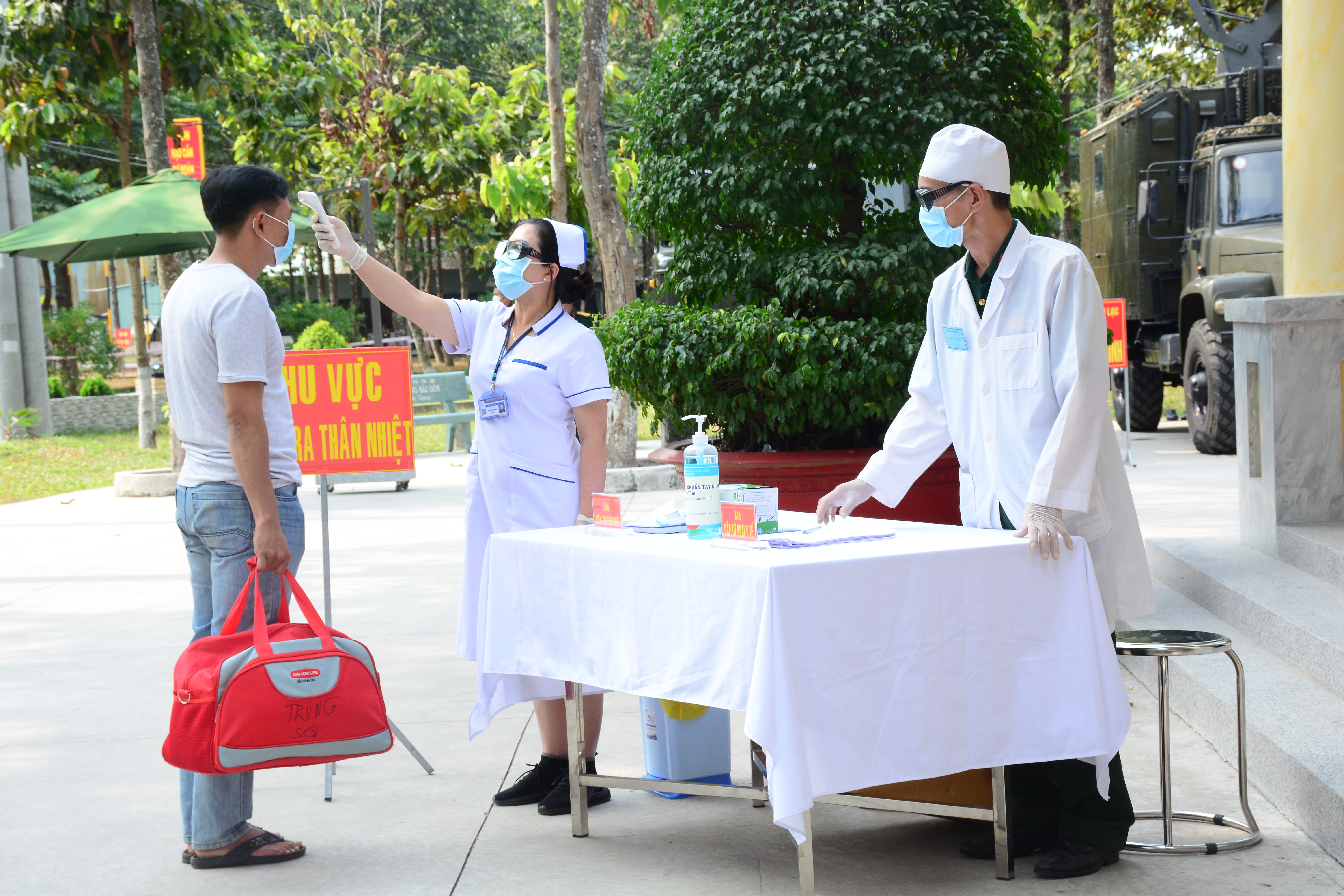 Cán bộ Quân khu 7 phát tờ khai y tế cho người đến cách ly trong diễn tập phòng, chống dịch Covid – 19.