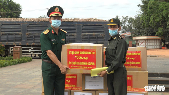 Thiếu tướng Nguyễn Trường Thắng - Phó Tư lệnh Quân khu 7 (trái) tặng vật chất, trang bị y tế cho đại diện quân đội Hoàng gia Campuchia tại cửa khẩu quốc tế Xa Mát (tỉnh Tây Ninh).
