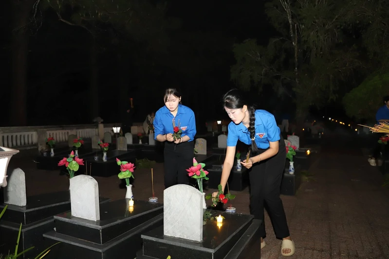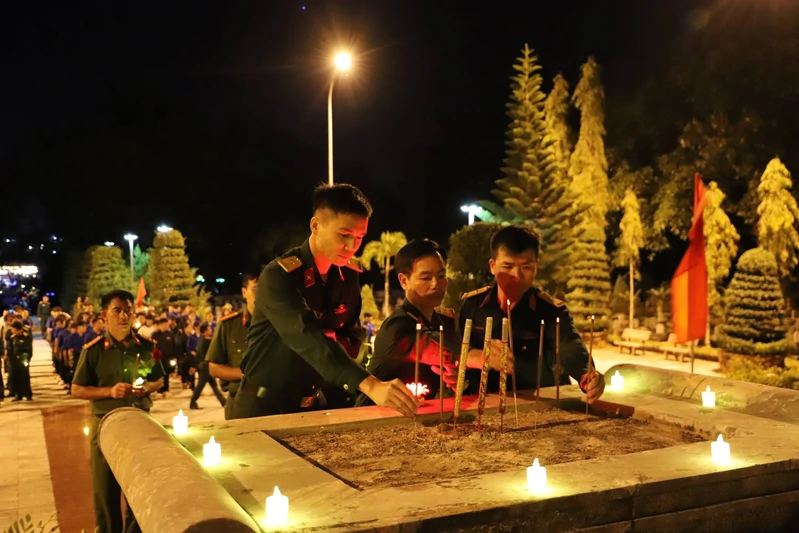 Trong không khí trang nghiêm, thành kính, đại diện cấp ủy, chính quyền địa phương, cán bộ, chiến sĩ LLVT tỉnh và Nhân dân đã dành phút mặc niệm tưởng nhớ các anh hùng liệt sĩ; thành kính dâng hương, thắp sáng hàng nghìn ngọn nến tri ân và đặt những đóa hoa hồng tươi thắm lên từng phần mộ. Ánh nến lung linh hòa quyện cùng sắc hoa đỏ thắm là thông điệp của lòng biết ơn, thể hiện đạo lý “Uống nước nhớ nguồn”, tri ân vô hạn đối với những người con ưu tú của dân tộc đã anh dũng hy sinh vì độc lập, tự do của Tổ quốc, vì hạnh phúc của Nhân dân.