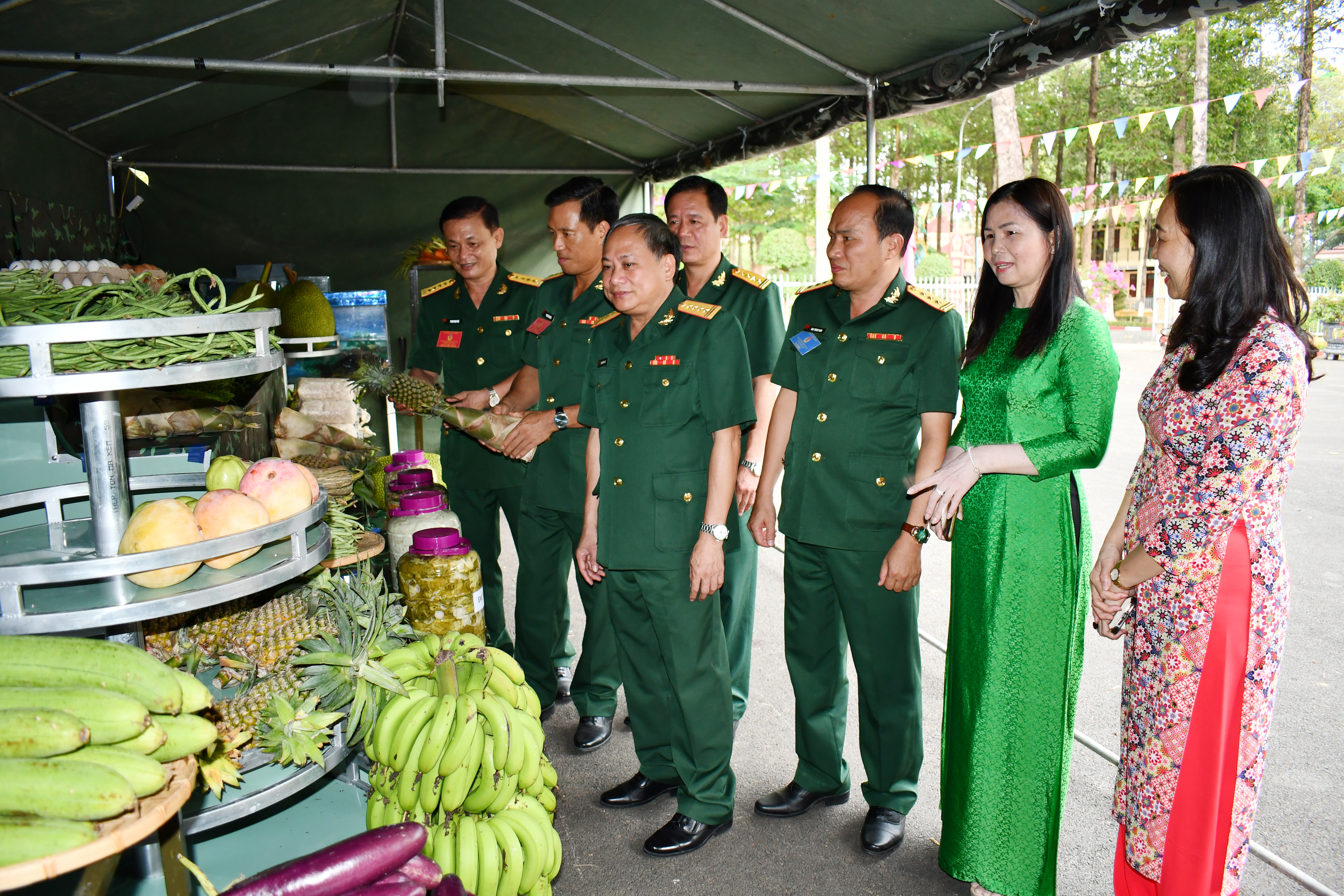 Thủ trưởng Cục Chính trị Quân khu và các đại biểu tham quan trưng bày sản phẩm tăng gia sản xuất của Lữ đoàn.