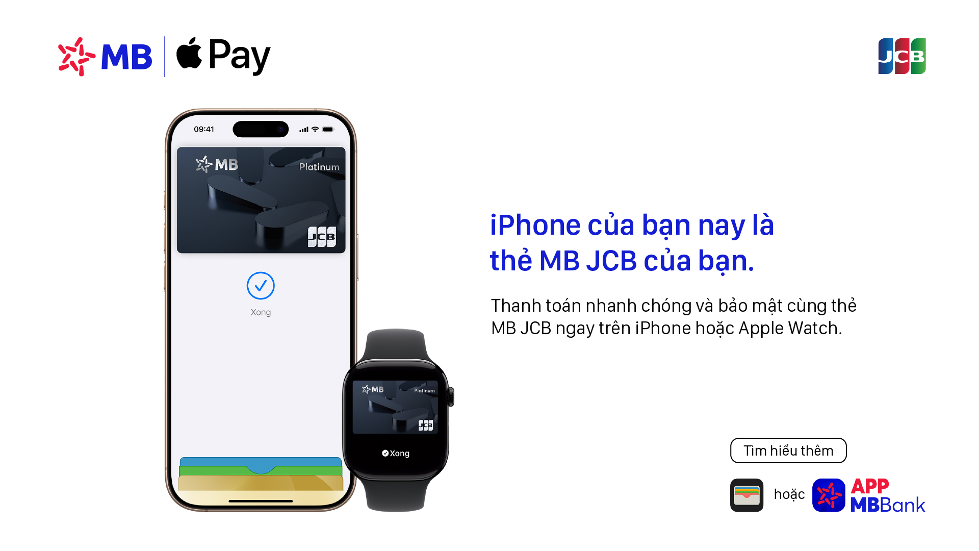 Ngày 1 tháng 7 năm 2025, Ngân hàng Thương mại Cổ phần Quân đội (MB) chính thức ra mắt Apple Pay cho chủ thẻ JCB. Apple Pay là phương thức nhanh chóng, bảo mật và riêng tư để thanh toán tại cửa hàng, trên app và thanh toán online.