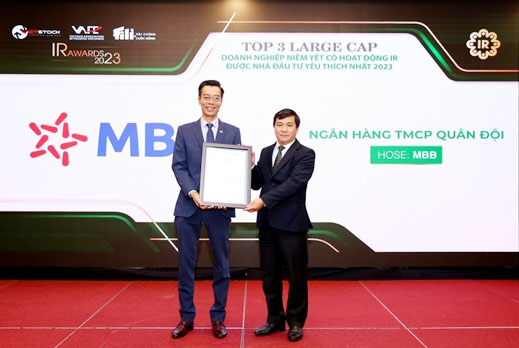 Tiếp nối năm 2022, năm nay, MB tiếp tục ghi danh vào Top 3 doanh nghiệp được nhà đầu tư yêu thích nhất. Ngân hàng này được Ban tổ chức IR Awards 2023 đánh giá cao là doanh nghiệp niêm yết “tuân thủ hoạt động công bố thông tin, có quản trị chiến lược, truyền thông tài chính minh bạch, đạt được hiệu quả giao tiếp giữa doanh nghiệp, cộng đồng tài chính cùng các thành phần khác, từ đó tối ưu giá trị doanh nghiệp”.