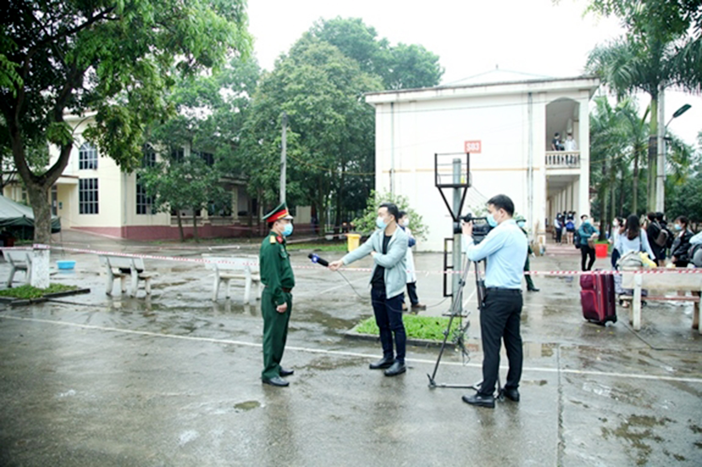 Phóng viên Đài PT-TH tỉnh Vĩnh Phúc tác nghiệp tại khu cách ly tập trung Trung đoàn 834, Bộ CHQS tỉnh Vĩnh Phúc. Ảnh: Baovinhphuc.com.vn