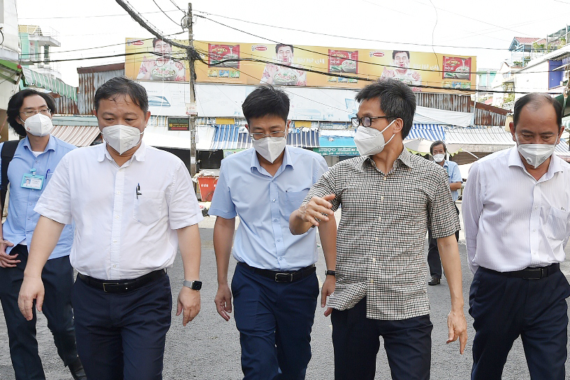 Phó Thủ tướng Vũ Đức Đam trao đổi với lãnh đạo Quận 8 khi đi thị sát khu phong tỏa chợ Nhị Thiên Đường. Ảnh: VGP/Đình Nam.