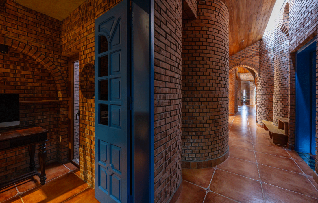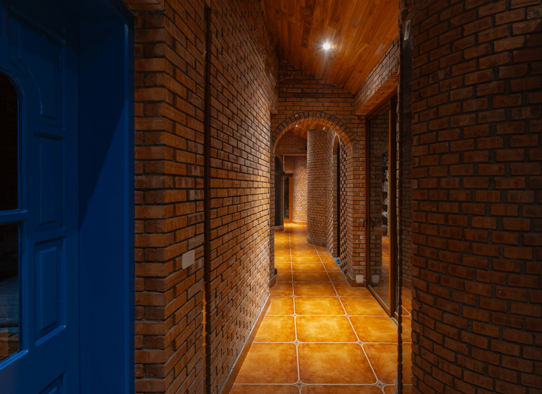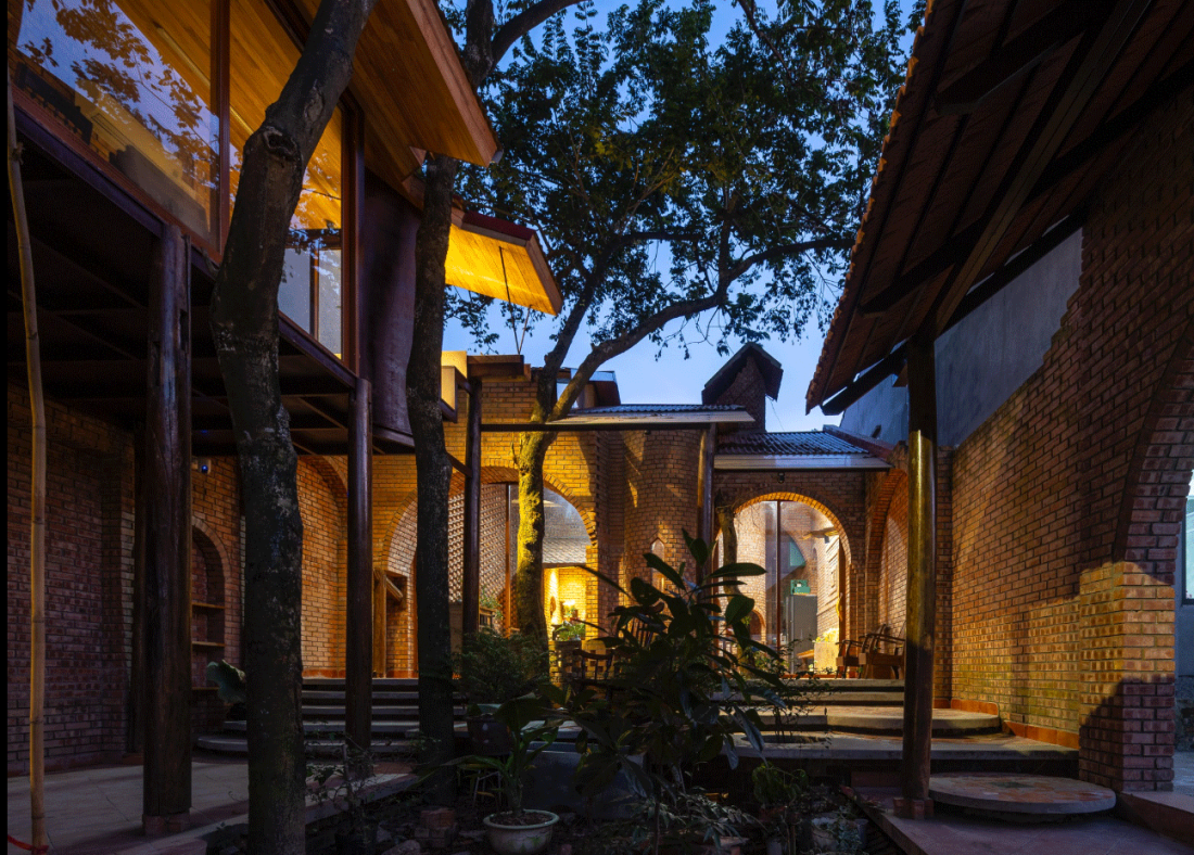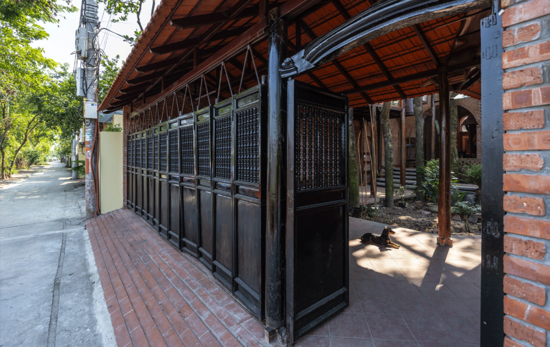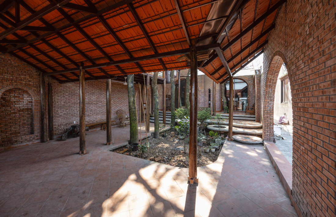 Gạch mộc tự nhiên: Toàn bộ không gian được xây dựng bằng gạch để mộc, tạo nên sự trầm mặc, mang nét hoài cổ. Nội thất sử dụng màu trầm và ưu tiên gỗ cũ từ những ngôi nhà xưa, các vật dụng được tái sử dụng hoàn toàn, vẫn còn giữ những nét đẹp của thời gian, tạo nên sự gần gũi và ấm cúng.