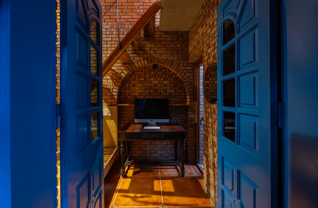 Những cánh cửa sơn màu xanh không chỉ làm điểm nhấn mà còn phá đi sự tĩnh lặng trong không gian trầm mạc.