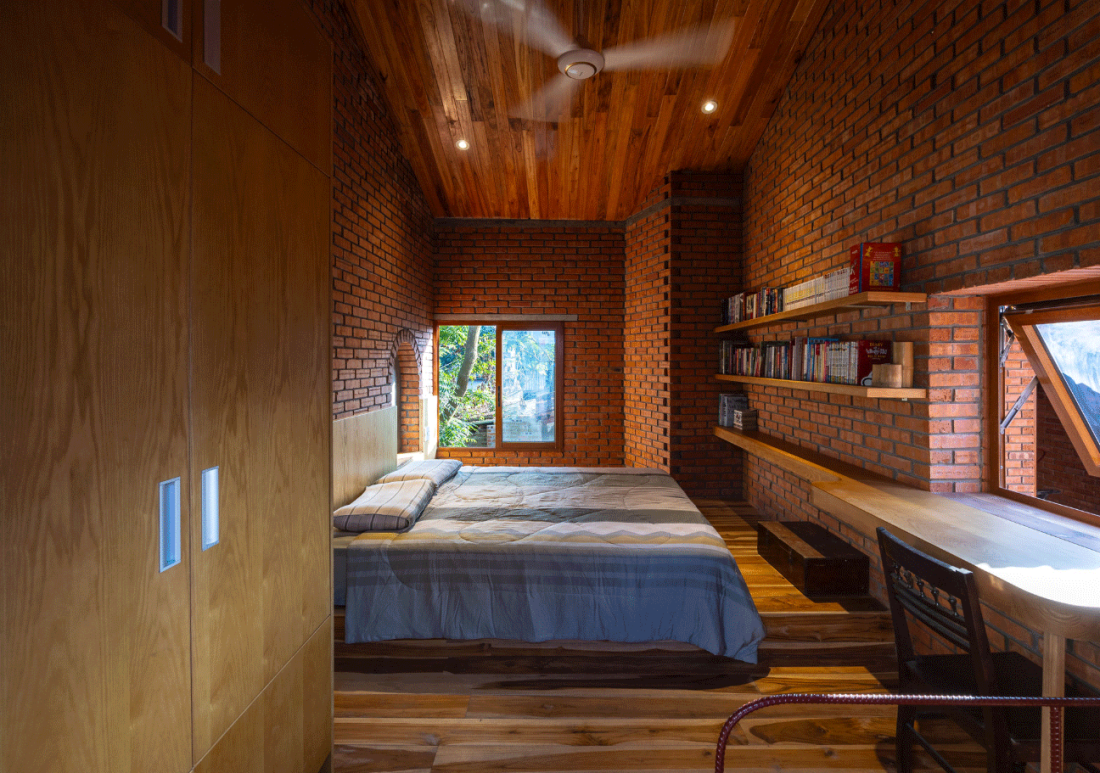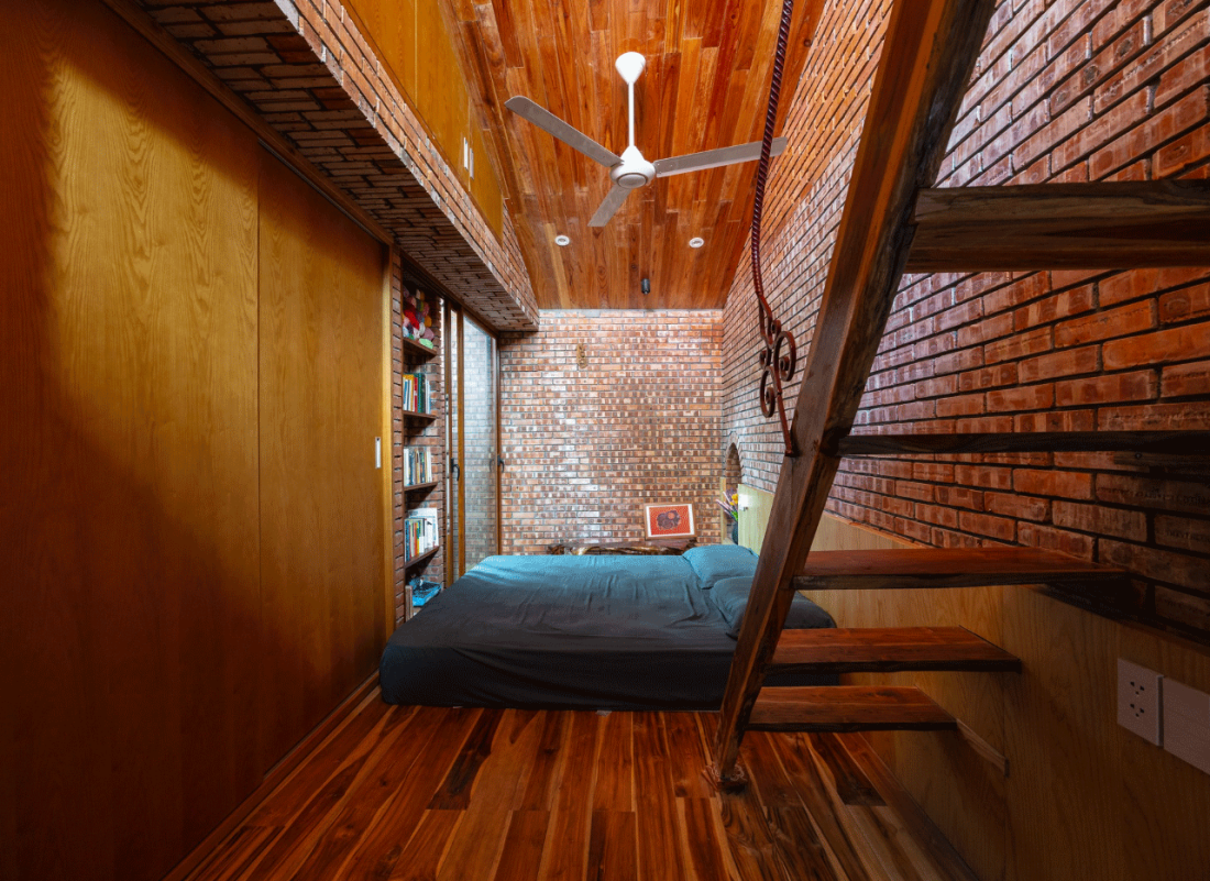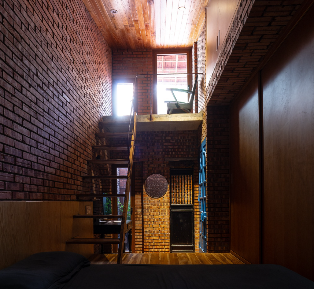 Cấu trúc nhà đơn giản: Ngôi nhà được thiết kế một tầng và một phòng ngủ trên gác lửng, tối ưu hóa sự mát mẻ và sự kết nối giữa các không gian.