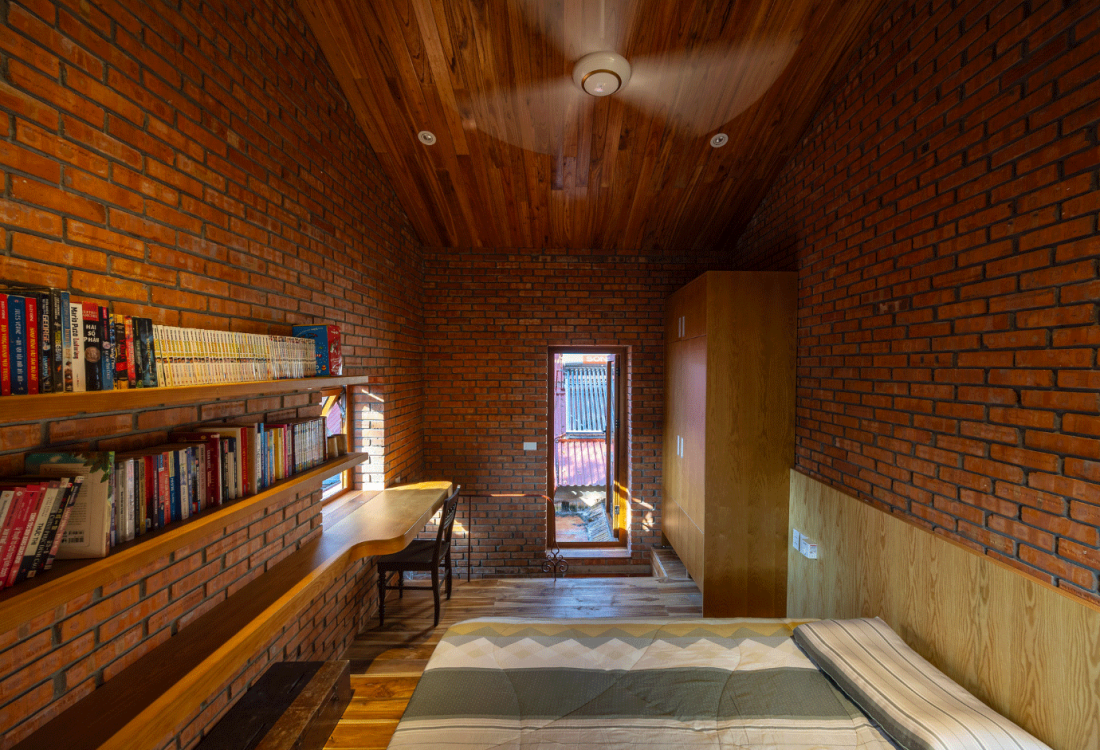 Dù phòng ngủ không lớn nhưng mỗi phòng đều có kệ sách và góc học riêng.