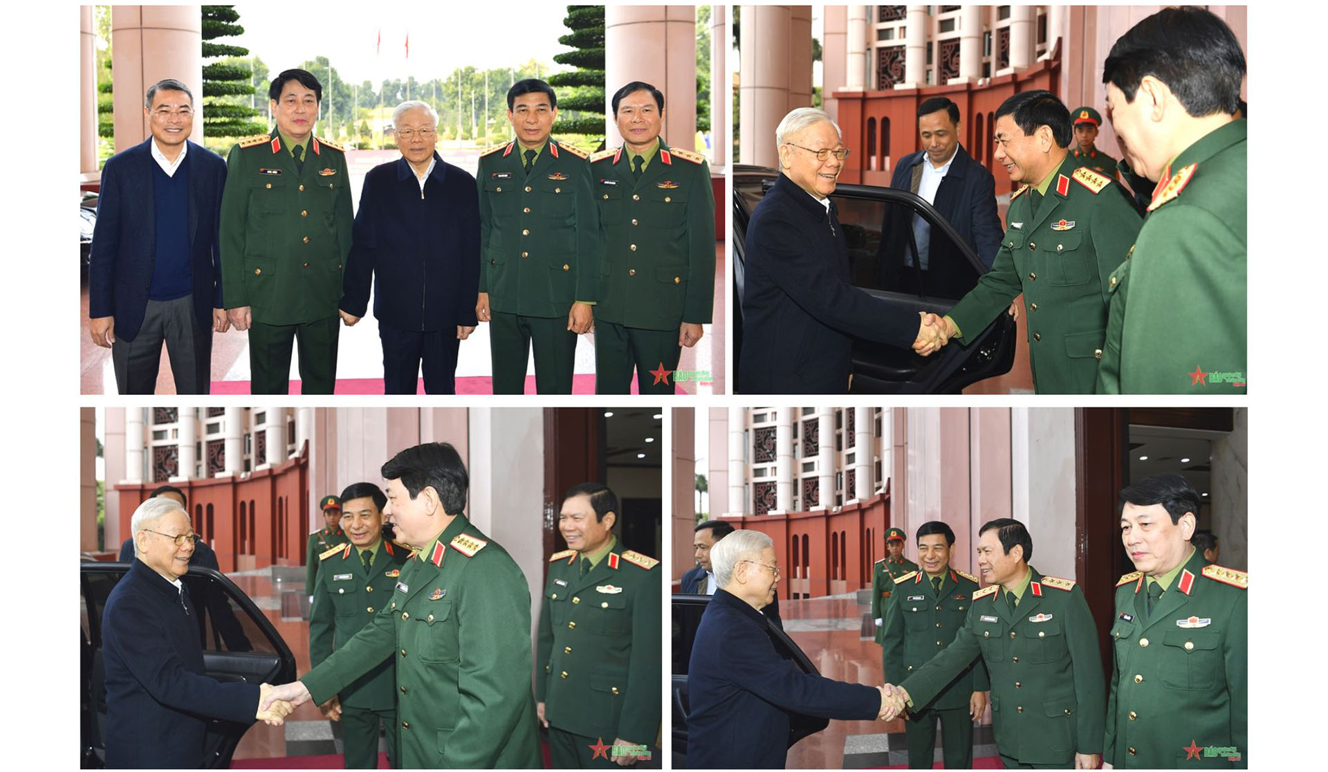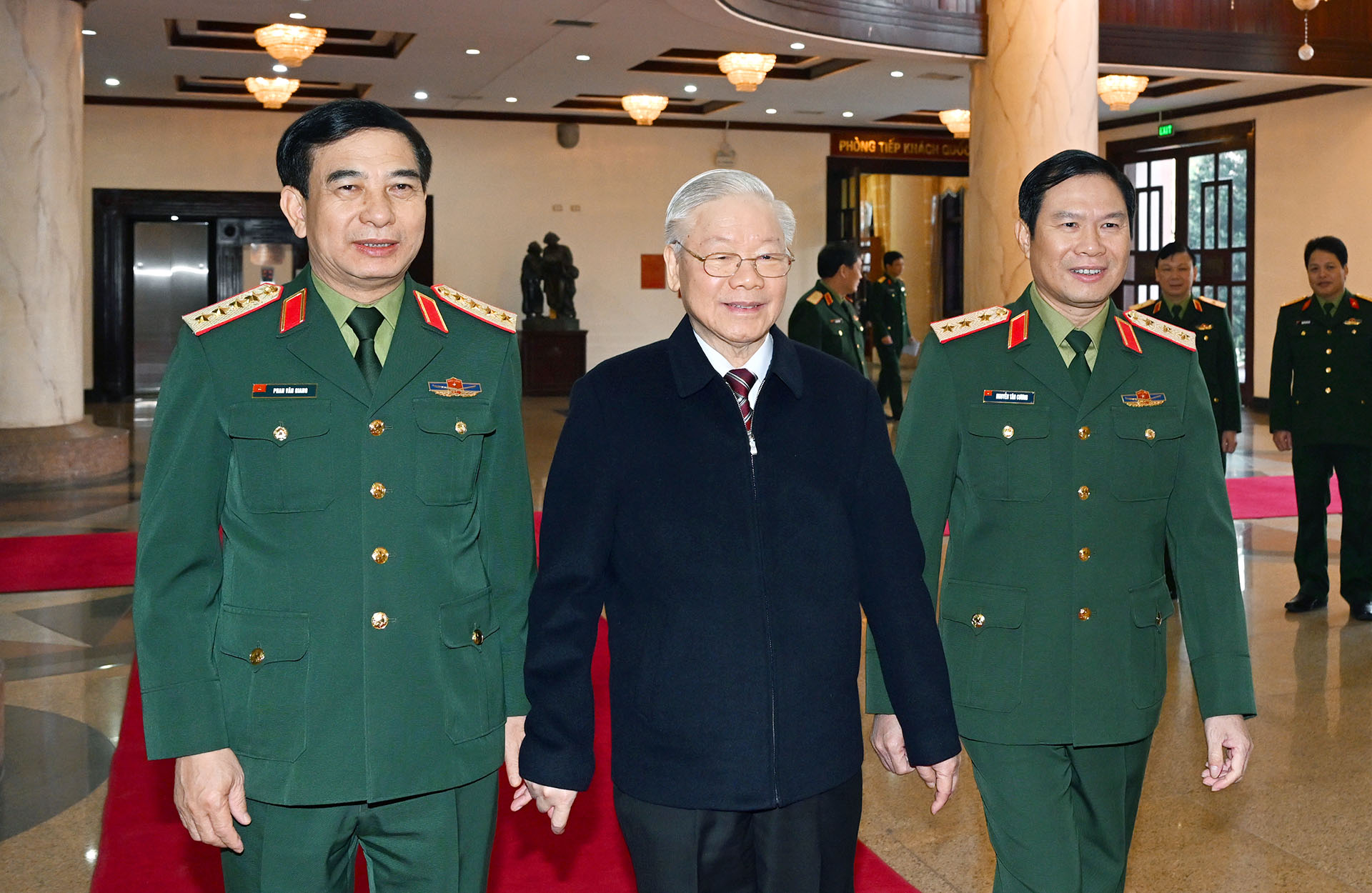 Các đồng chí lãnh đạo Quân ủy Trung ương, Bộ Quốc phòng đón Tổng Bí thư Nguyễn Phú Trọng, Bí thư Quân ủy Trung ương dự và chỉ đạo Hội nghị lần thứ tám của Quân ủy Trung ương, nhiệm kỳ 2020-2025. Ảnh: TUẤN HUY