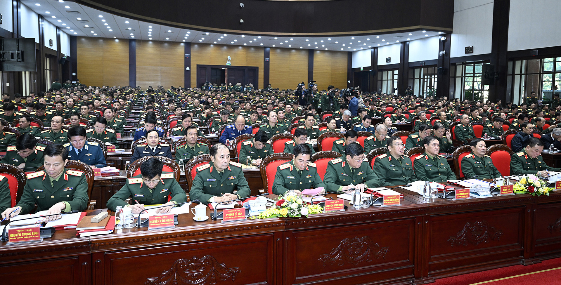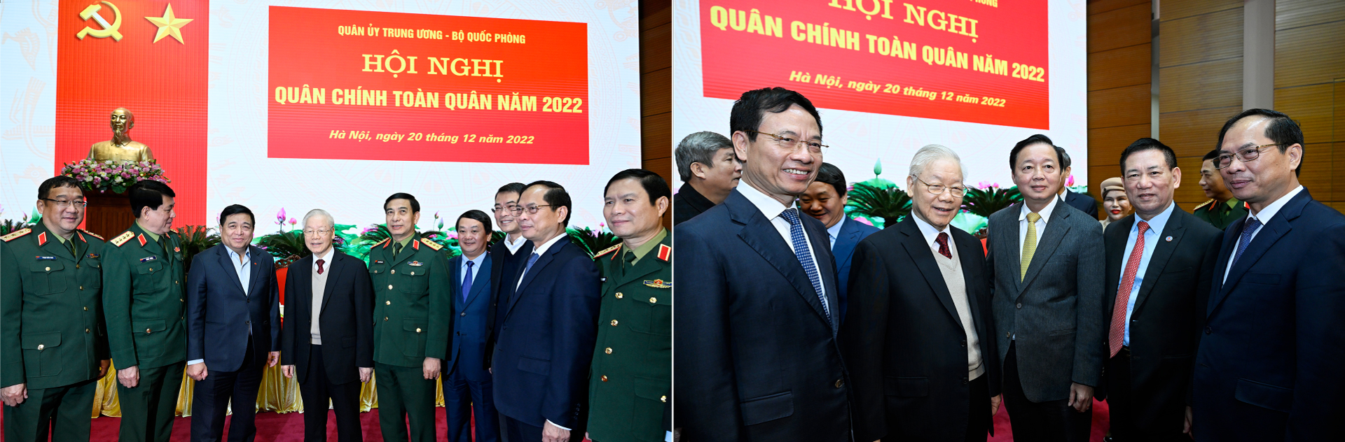 Tổng Bí thư Nguyễn Phú Trọng cùng các đồng chí lãnh đạo Bộ Quốc phòng và đại biểu dự Hội nghị quân chính toàn quân năm 2022. Ảnh: TUẤN HUY