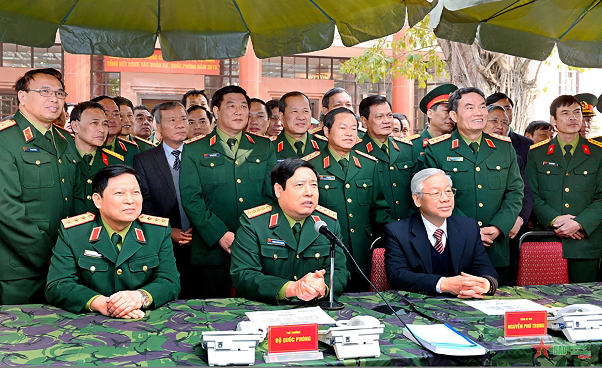Tổng Bí thư Nguyễn Phú Trọng cùng các thủ trưởng Bộ Quốc phòng, Tổng cục Chính trị Quân đội nhân dân Việt Nam, Bộ Tổng Tham mưu Quân đội nhân dân Việt Nam giao lưu trực tuyến với bộ đội Trường Sa tại Hội nghị Quân chính toàn quân năm 2013. Ảnh: NGUYỄN MINH TRƯỜNG