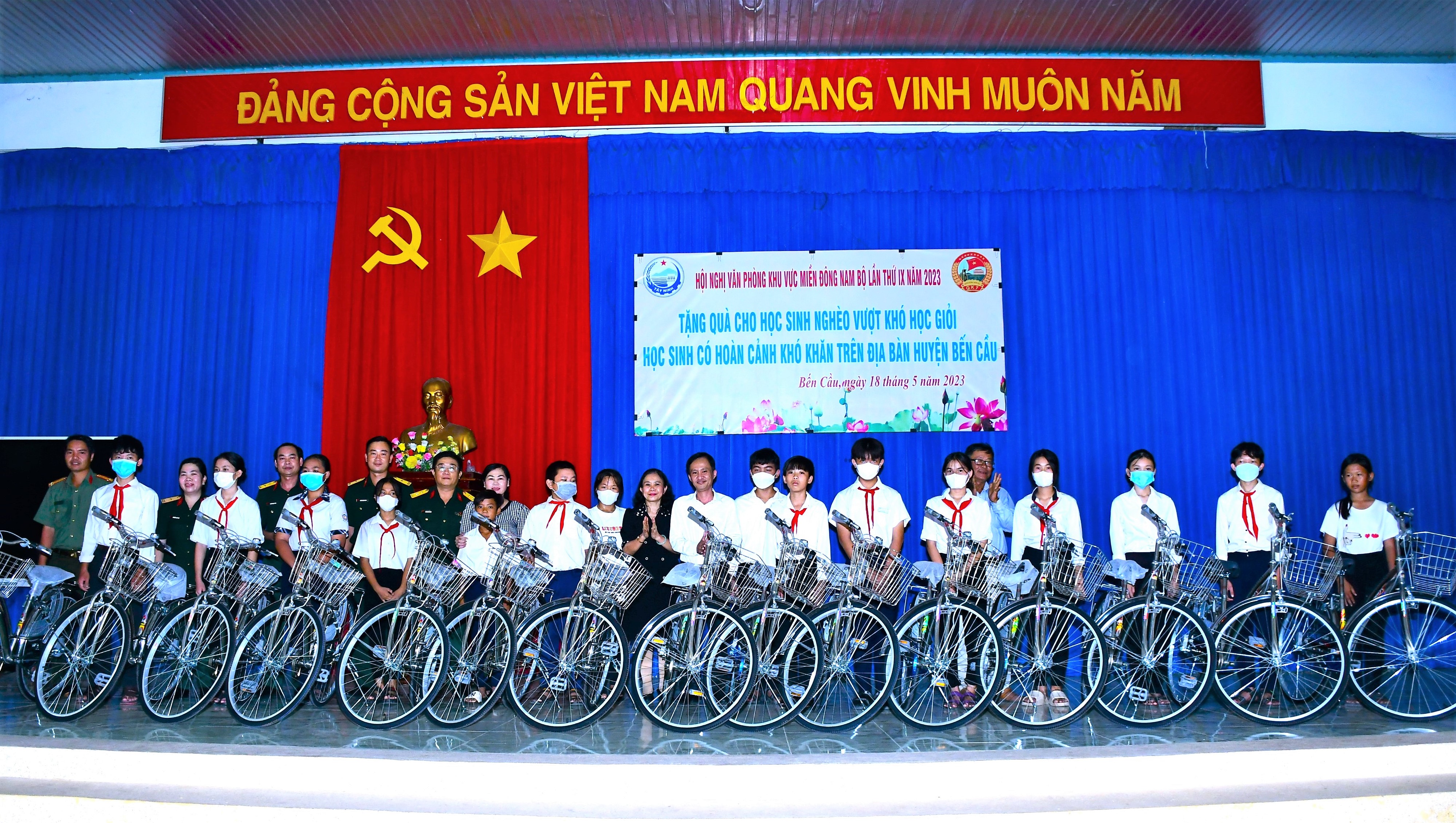 Đại diện Văn phòng Quân khu 7 và Văn phòng Tỉnh ủy Tây Ninh trao tặng xe đạp cho học sinh nghèo hiếu học của huyện Bến Cầu, tỉnh Tây Ninh.
