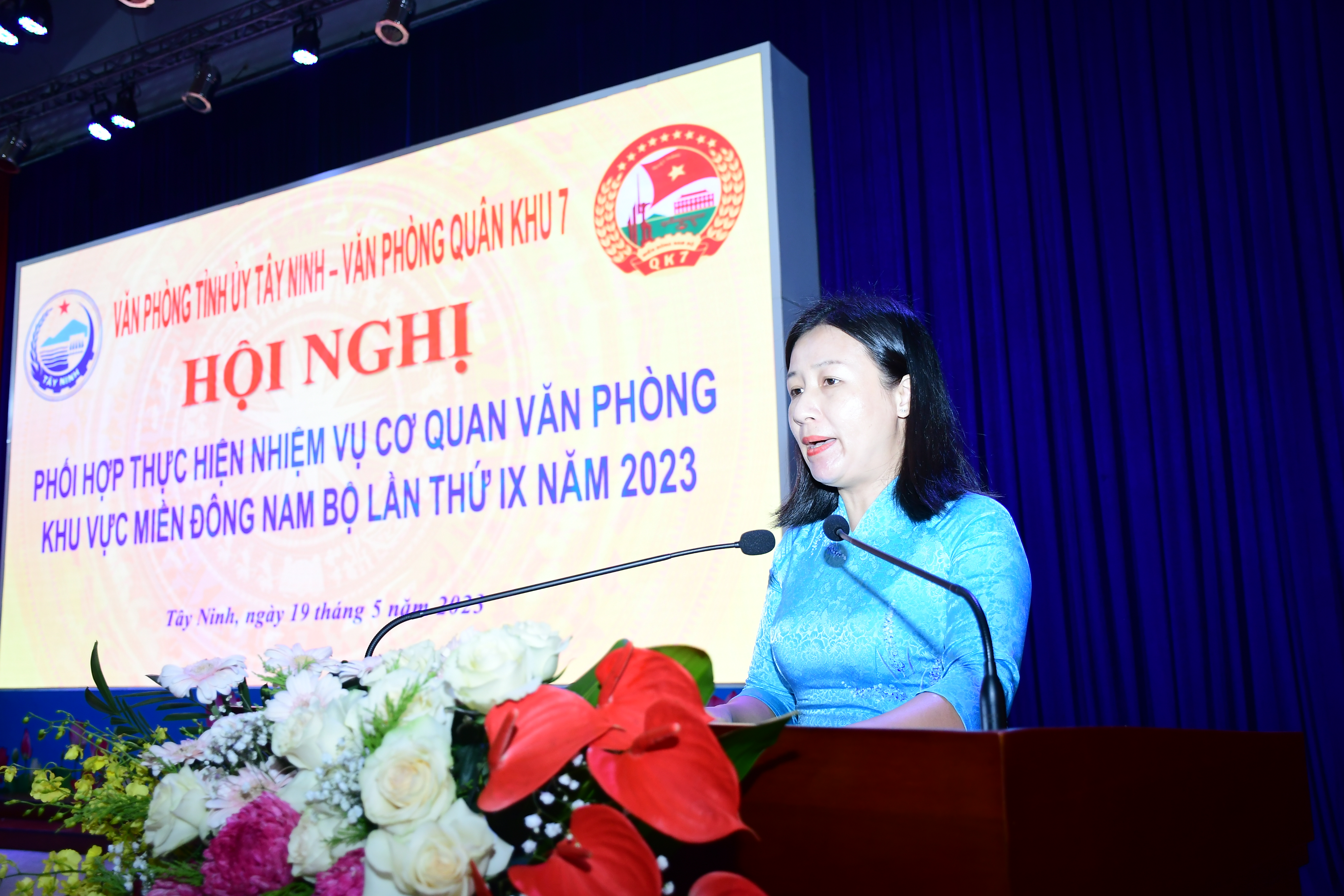 Đồng chí Huỳnh Thị Hồng Nhung, Chánh Văn phòng Tỉnh ủy Tây Ninh và Thượng tá Huỳnh Việt Tâm, Chánh Văn phòng Quân khu 7 đồng chủ trì hội nghị. Tham dự hội nghị có Thủ trưởng các cơ quan, đơn vị LLVT Quân khu; lãnh đạo Văn phòng Tỉnh (Thành) ủy, Văn phòng Đoàn Đại biểu Quốc hội-HĐND, Văn phòng UBND 9 tỉnh, thành phố trên địa bàn miền Đông Nam Bộ; đại diện lãnh đạo Văn phòng Quốc hội, Bộ Công an, Bộ Tư lệnh Cảnh vệ; các đơn vị kết nghĩa, cơ quan, đơn vị, doanh nghiệp đồng hành với LLVT Quân khu trong thực hiện nhiệm vụ quân sự, quốc phòng…