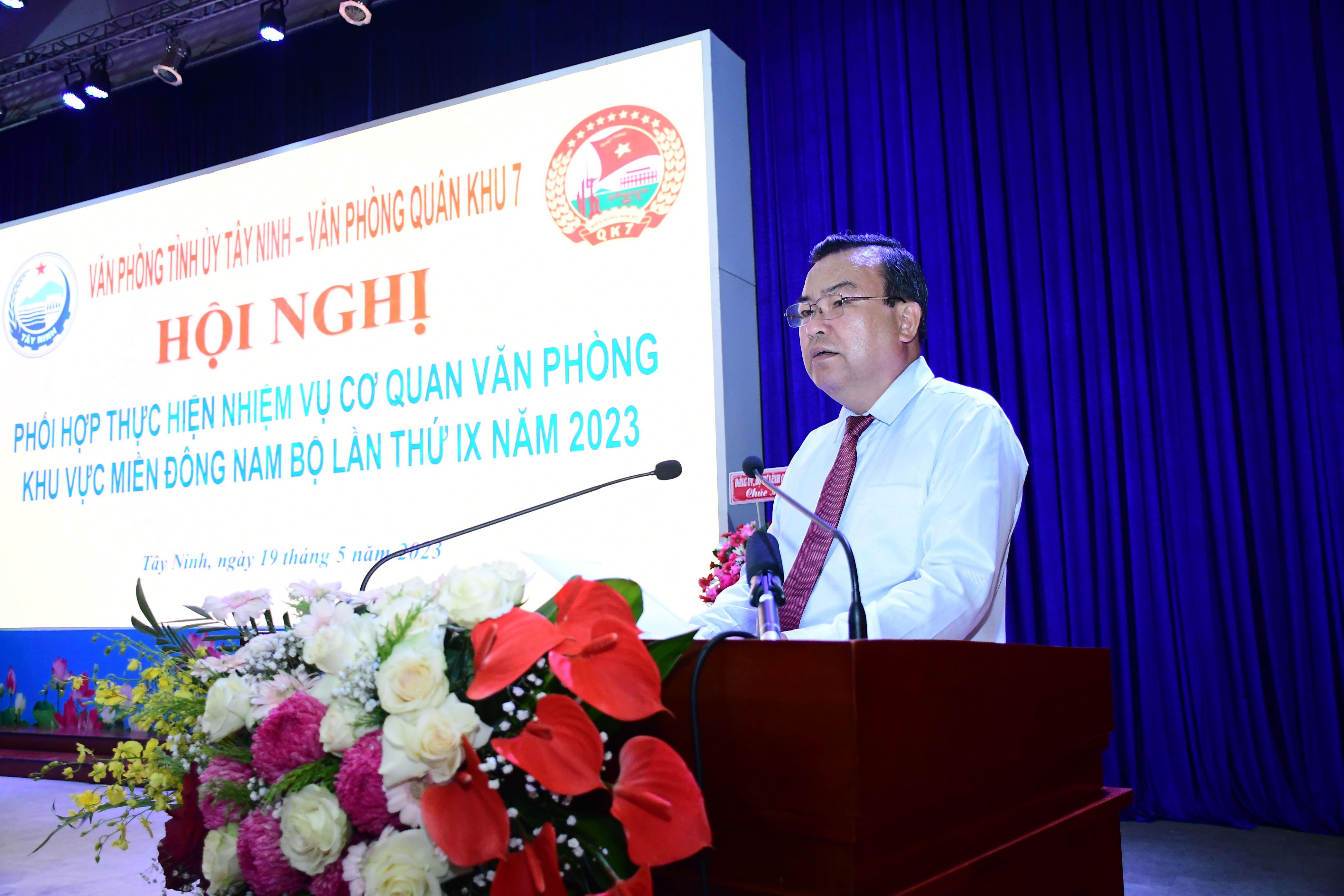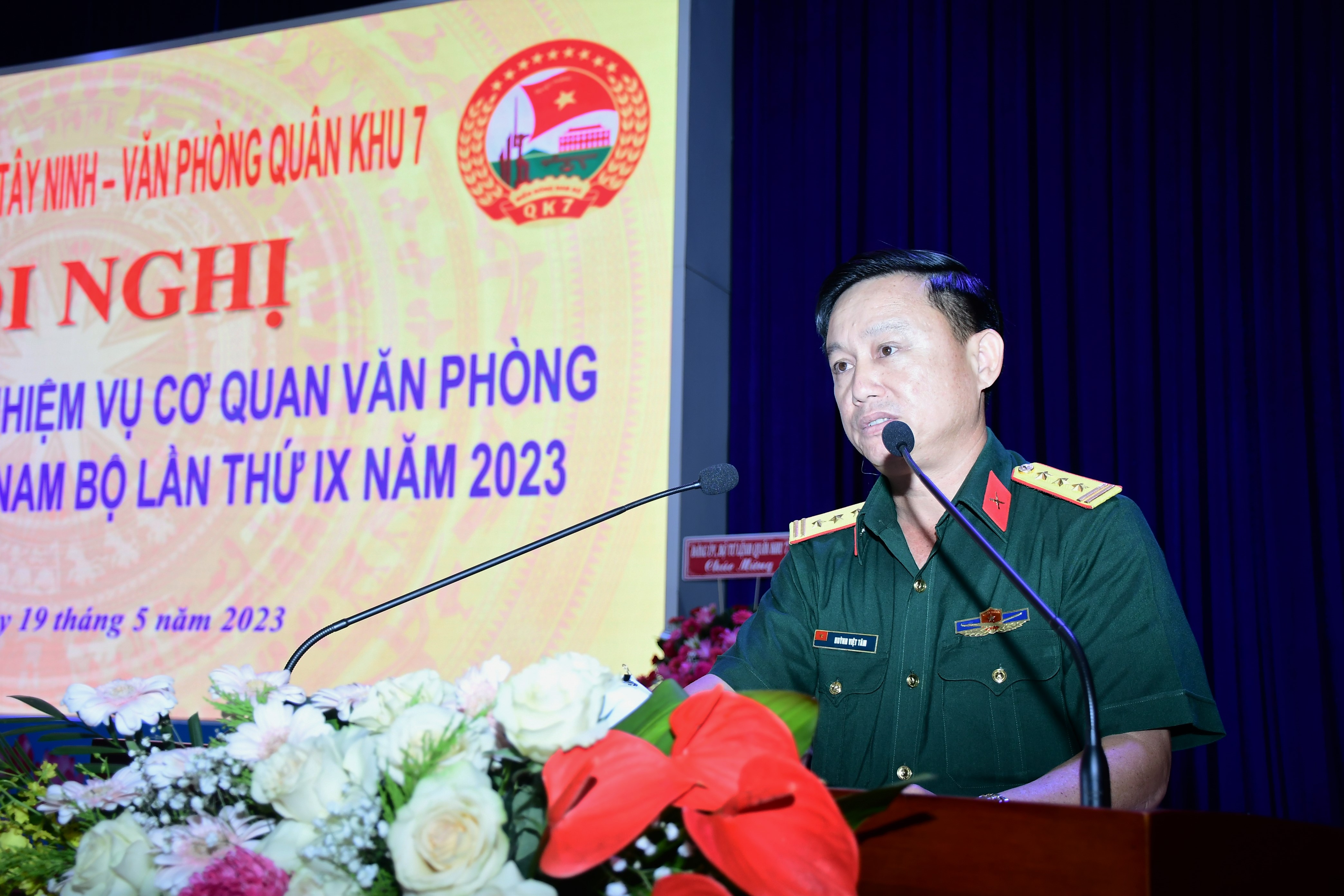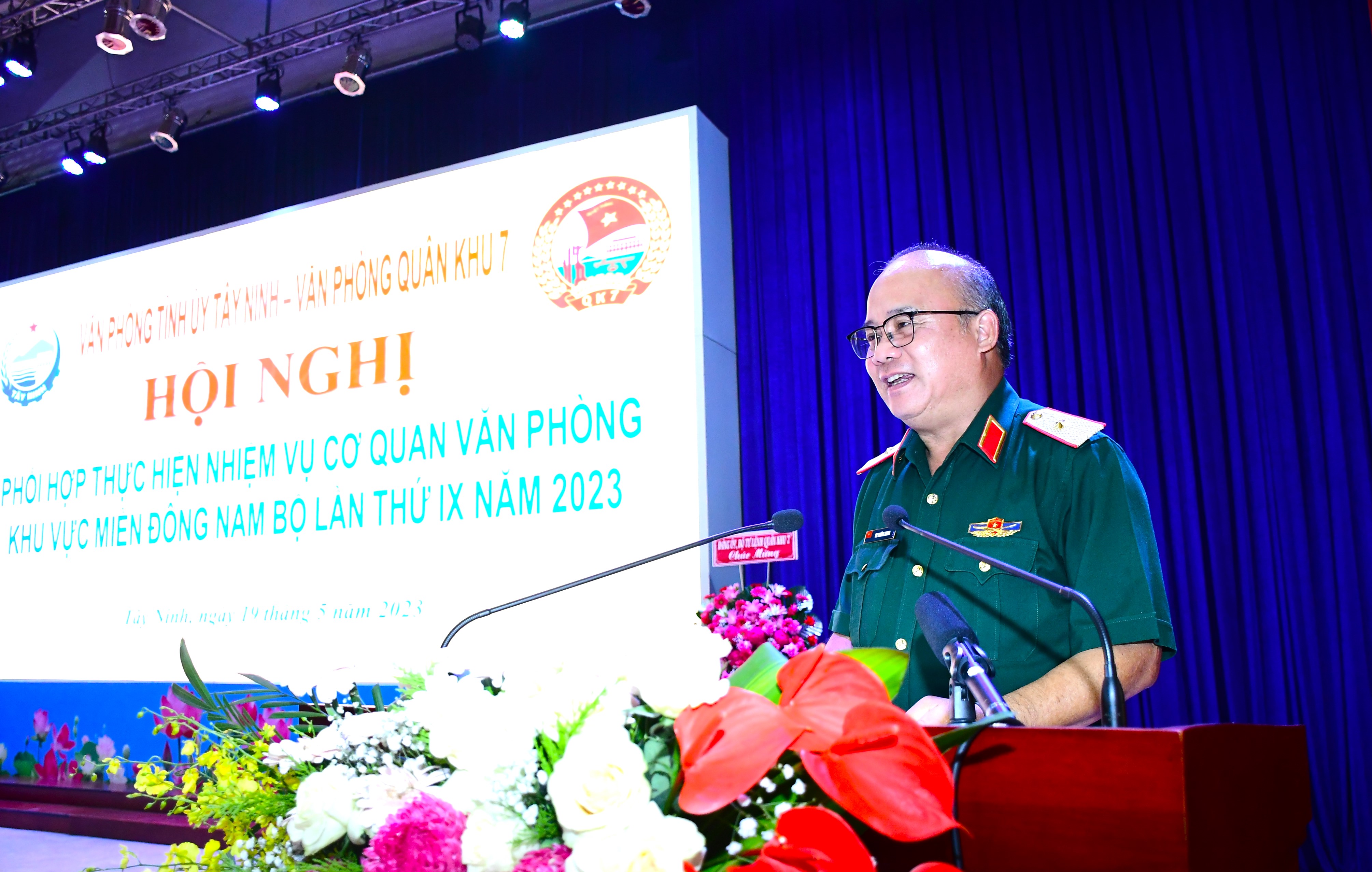 Phát biểu chỉ đạo tại hội nghị, Thiếu tướng Du Trường Giang, Phó Tư lệnh Quân khu 7 nhấn mạnh, Quân khu 7 là địa bàn chiến lược, trọng điểm phía Nam. LLVT Quân khu 7 năm 2022 đã đạt nhiều kết quả nổi bật, thực hiện tốt nhiệm vụ chính trị trọng tâm. Trong thành quả ấy có sự quan tâm, hỗ trợ của cấp ủy, chính quyền địa phương, sự đồng hành của các doanh nghiệp, cá nhân, nhất là công tác tham mưu đúng, trúng, kịp thời của hệ thống văn phòng các cấp trên địa bàn.