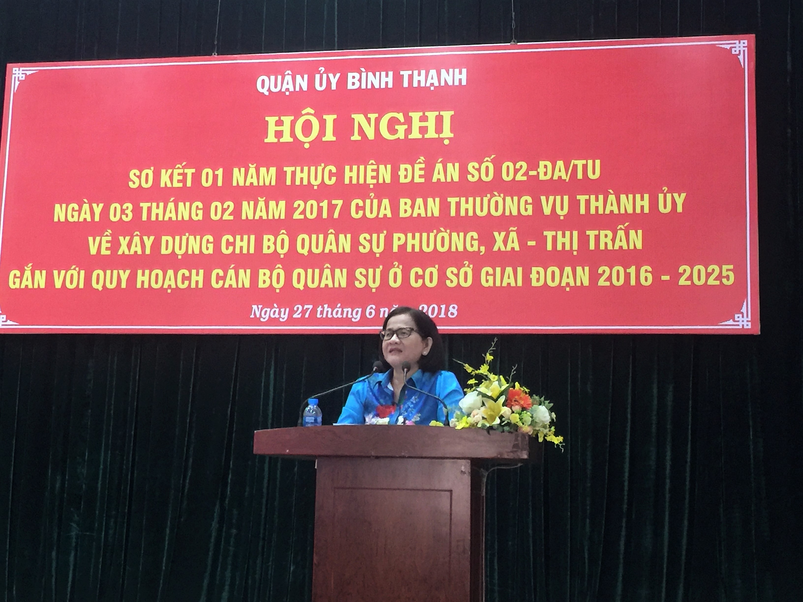 (QK7 - Online)Ngày 27-6, Quận ủy Bình Thạnh, Thành phố Hồ Chí Minh tổ chức sơ kết 1 năm thực hiện Đề án số 2 ngày 3 tháng 2 năm 2017 của Ban Thường vụ Thành ủy; Kế hoạch số 40 ngày 31 tháng 3 năm 2017 của Ban Thường vụ Quận ủy về xây dựng chi bộ quân sự phường gắn với quy hoạch cán bộ quân sự ở cơ sở giai đoạn 2016 - 2025.