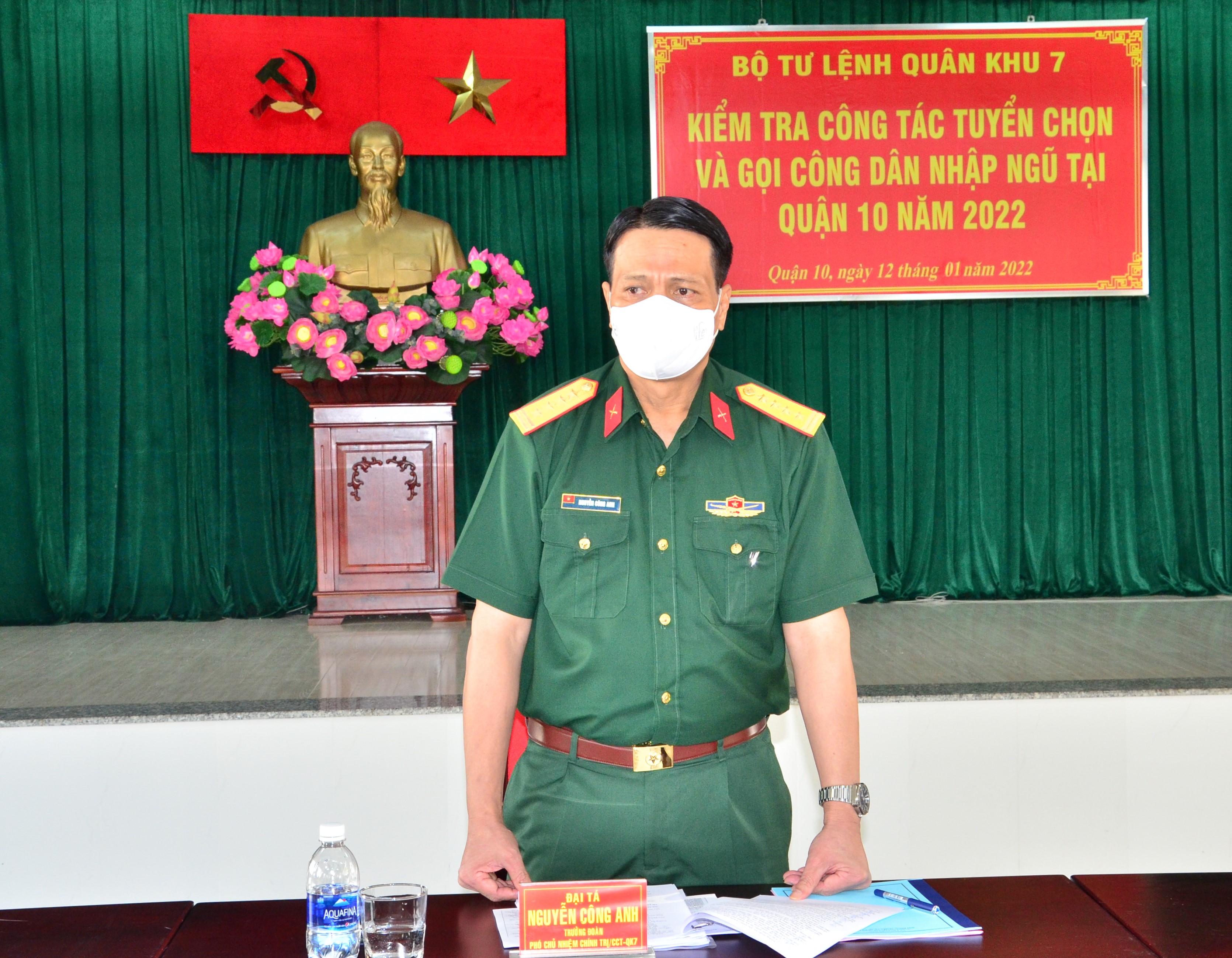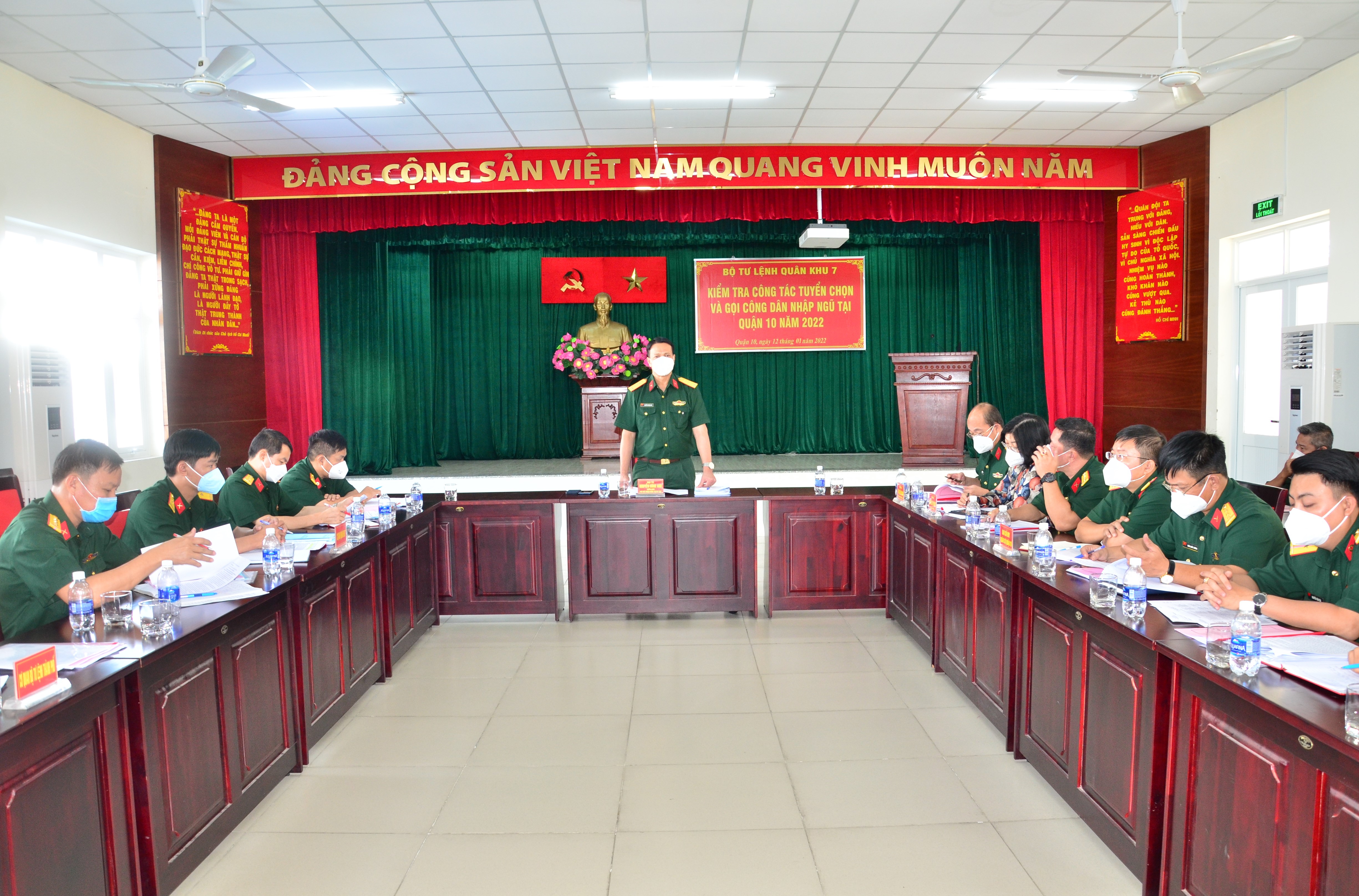 (QK7 Online) - Ngày 12-1, Đoàn kiểm tra Quân khu 7 do Đại tá Nguyễn Công Anh, Phó Chủ nhiệm Chính trị Quân khu làm trưởng Đoàn có buổi kiểm tra việc thực hiện quy trình các bước tuyển chọn và gọi công dân nhập ngũ năm 2022 của Hội đồng nghĩa vụ Quân sự quận 10. Đồng chí Nguyễn Thị Thu Hường, Chủ tịch UBND, Chủ tịch HĐNVQS quận 10 tiếp và làm việc với đoàn.