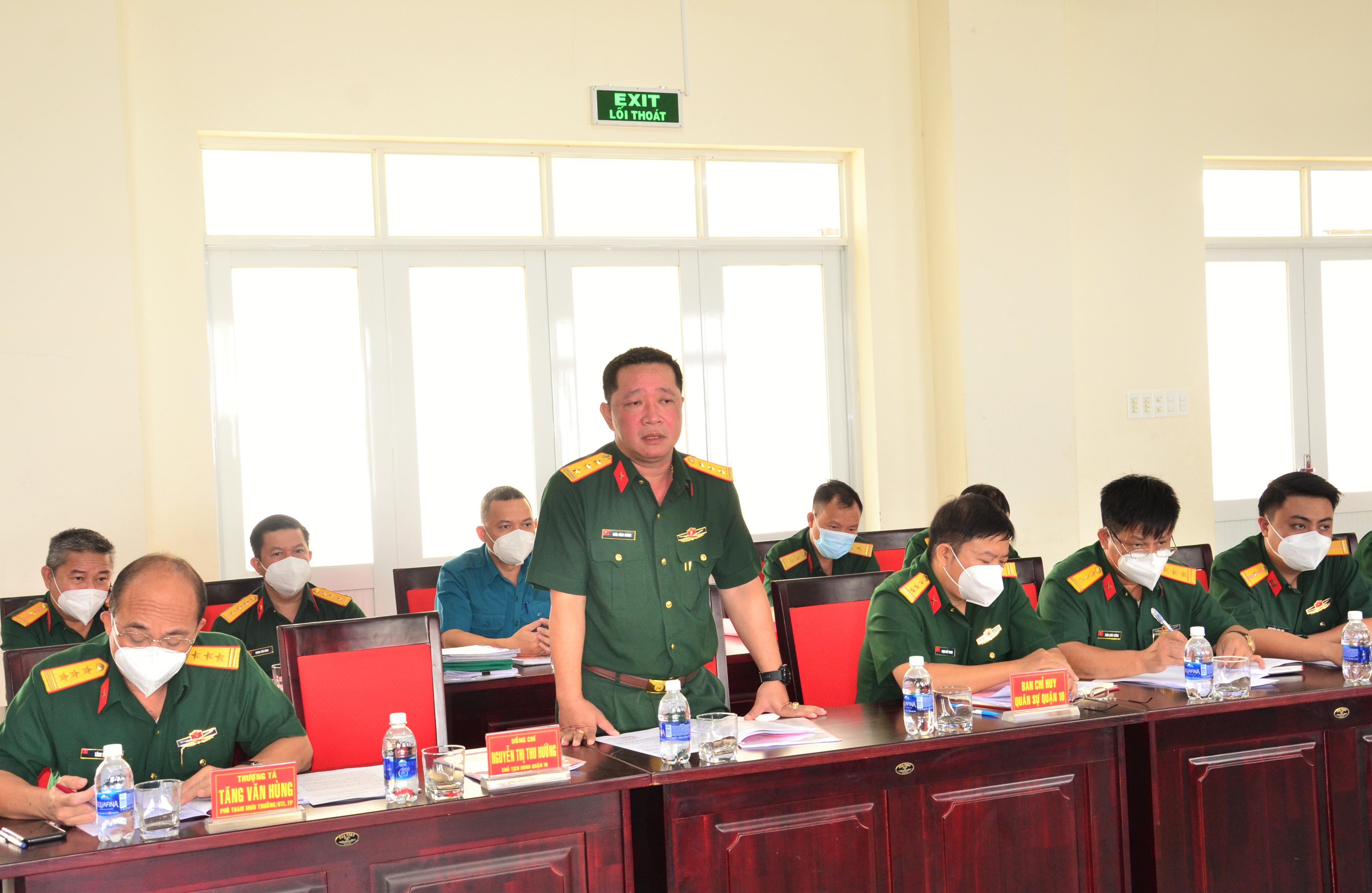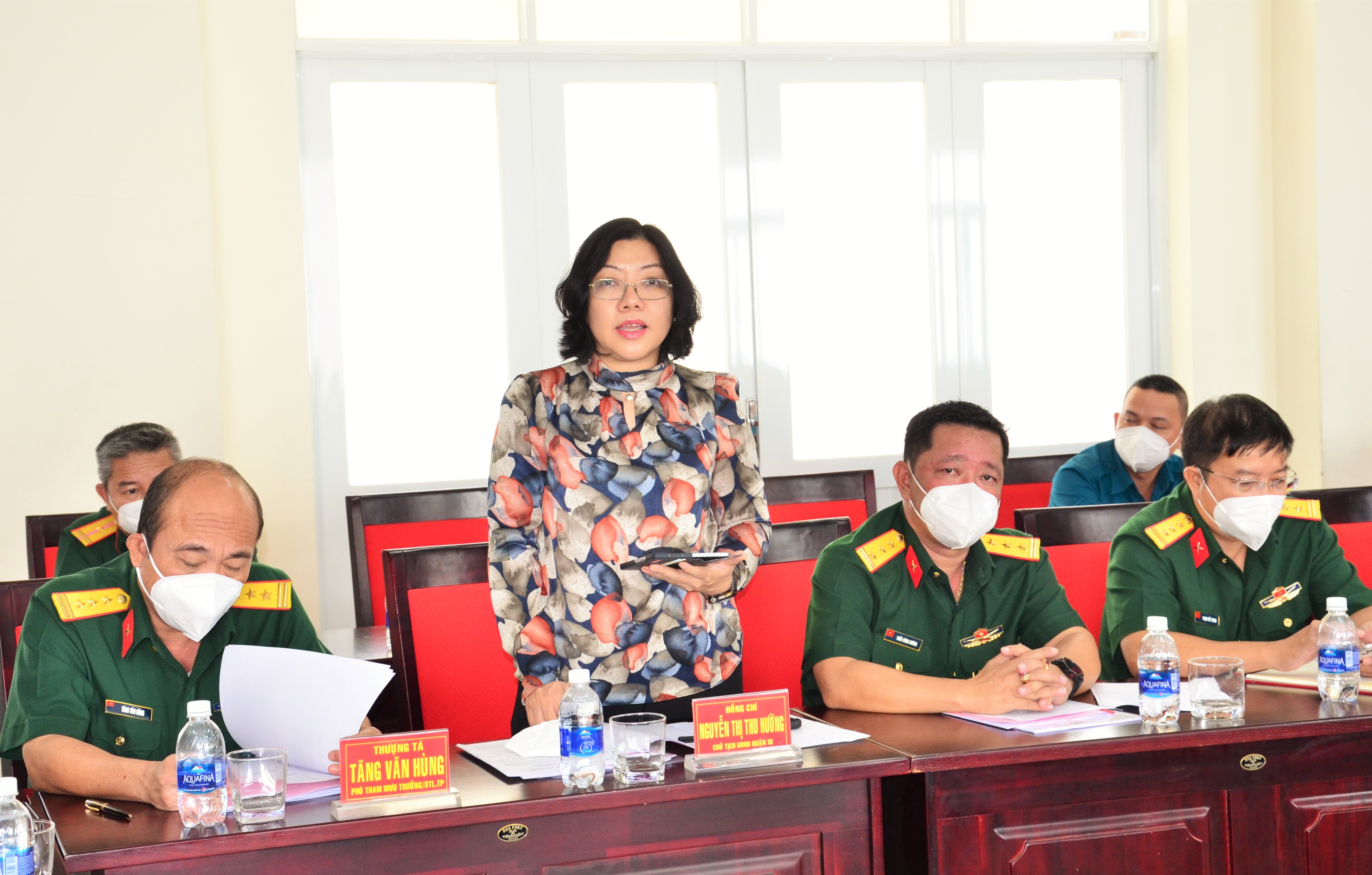 Đồng chí Nguyễn Thị Thu Hường, Chủ tịch UBND, Chủ tịch HĐ NVQS quận 10 phát biểu.