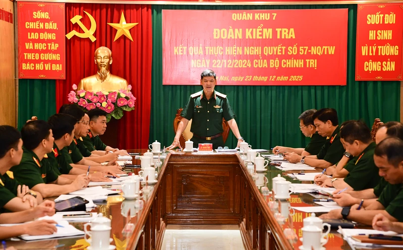 (QK7 Online) – Sáng ngày 23/12, Đoàn công tác Quân khu 7 do Thiếu tướng Trần Ngọc Minh, Phó Tư lệnh Quân khu 7 làm trưởng đoàn tiến hành kiểm tra kết quả thực hiện Nghị quyết số 57 - NQ/TW ngày 22/12/2024 của Bộ Chính trị về công tác phát triển khoa học công nghệ, đổi mới sáng tạo và chuyển đổi số quốc gia tại Bộ CHQS tỉnh Đồng Nai. Tham gia cùng đoàn công tác có Thủ trưởng Bộ Tham mưu, Cục Chính trị, Cục Hậu cần - Kỹ thuật và các cơ quan Quân khu.