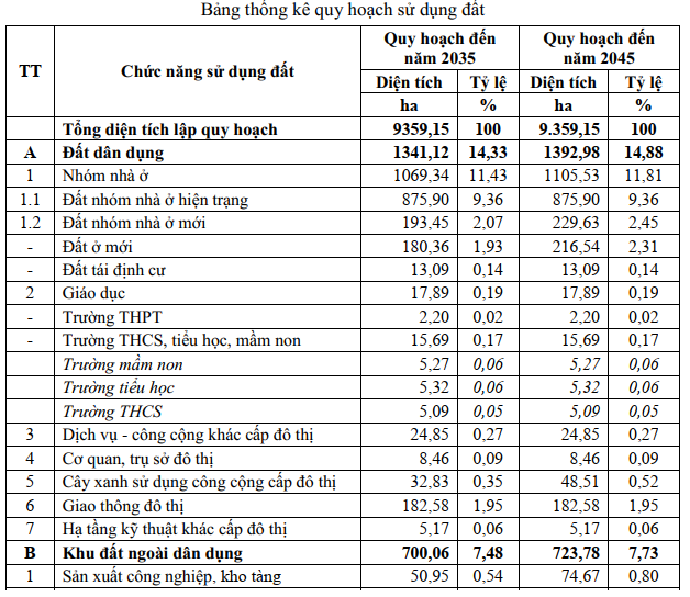 Cơ cấu sử dụng đất được chia theo hai giai đoạn: đến 2035 và đến 2045, với tổng diện tích giữ nguyên 9.359,15ha. Tỷ lệ đất dân dụng chiếm khoảng 14–15%; đất ngoài dân dụng 7–8%; phần lớn còn lại là đất nông nghiệp và các chức năng khác.