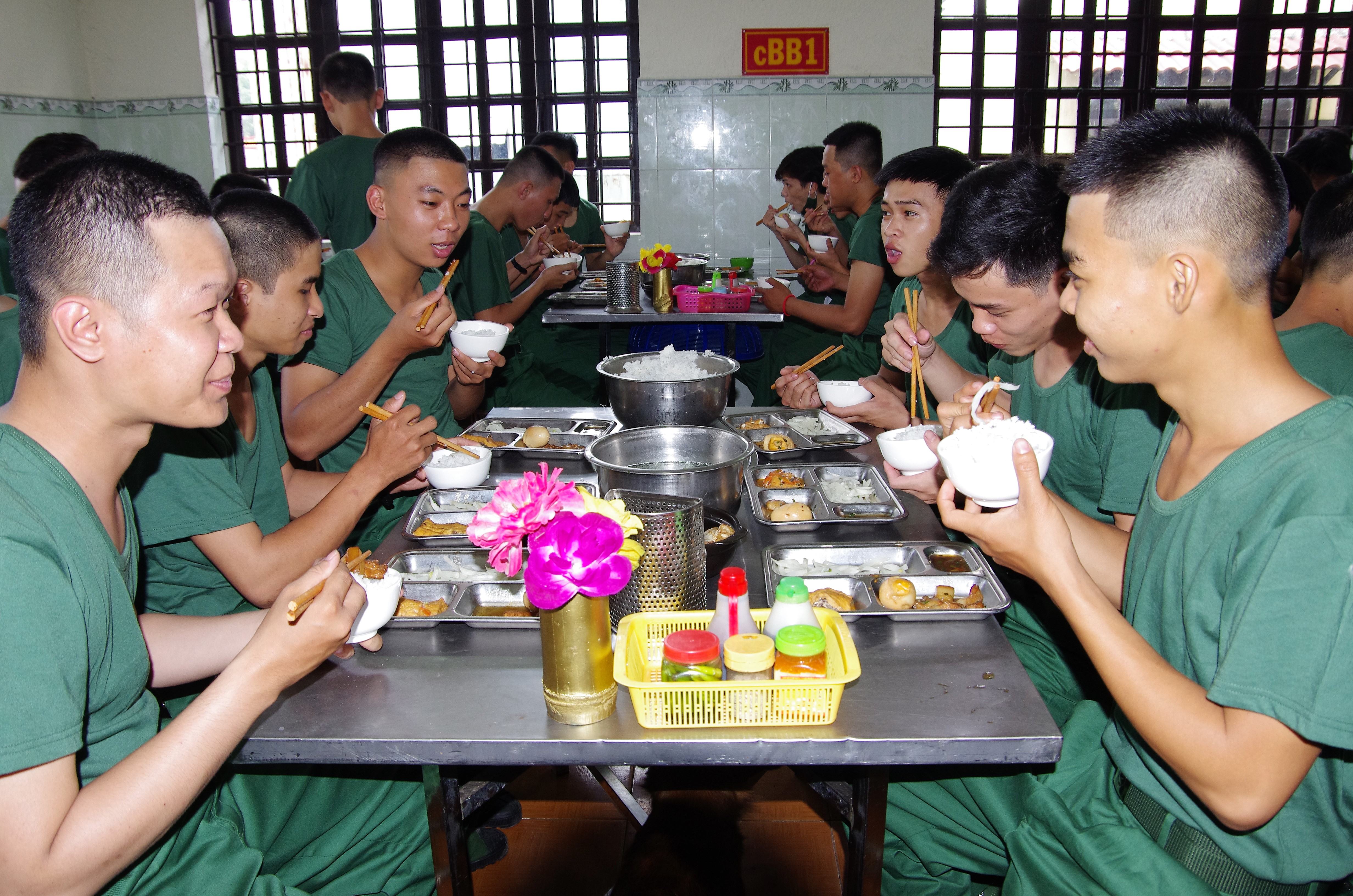 Chiến sĩ mới dùng bữa cơm đầu tiên tại đơn vị.