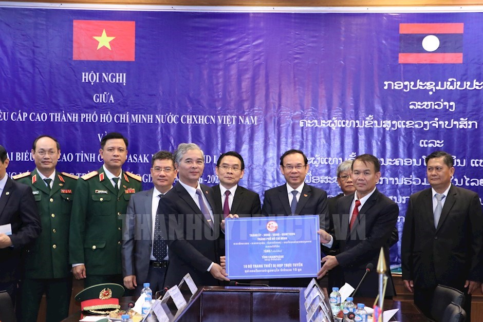 Dịp này, TPHCM trao tặng cho tỉnh Champasak 10 bộ trang thiết bị họp trực tuyến; Saigontourist tặng 5 suất học bổng trị giá 1,5 tỷ đồng cho tỉnh Champasak.