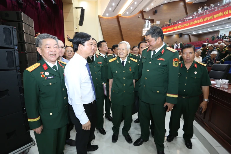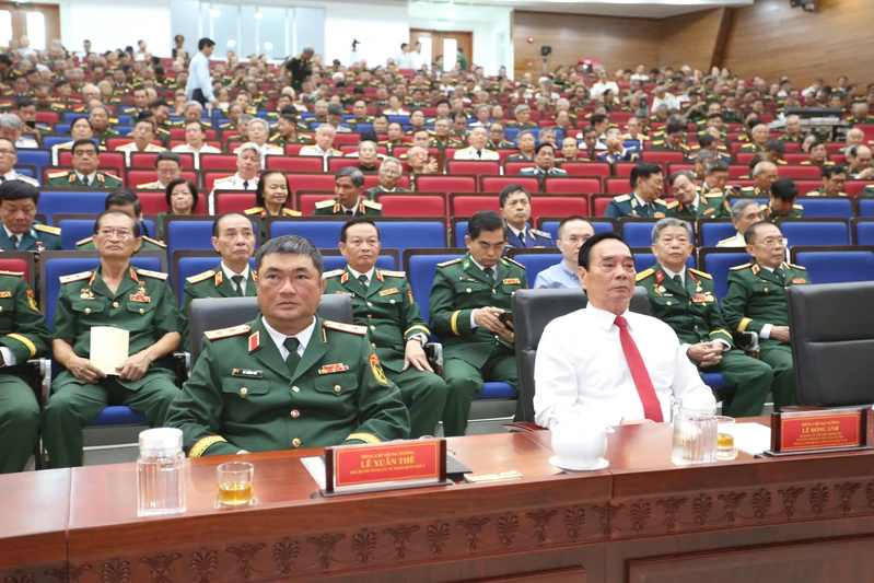 Trung tướng Lê Xuân Thế, Tư lệnh Quân khu 7 và Đại tướng Lê Hồng Anh, nguyên Ủy viên Bộ Chính trị, nguyên Thường trực Ban Bí thư Trung ương Đảng cùng các đại biểu tham dự buổi gặp mặt.