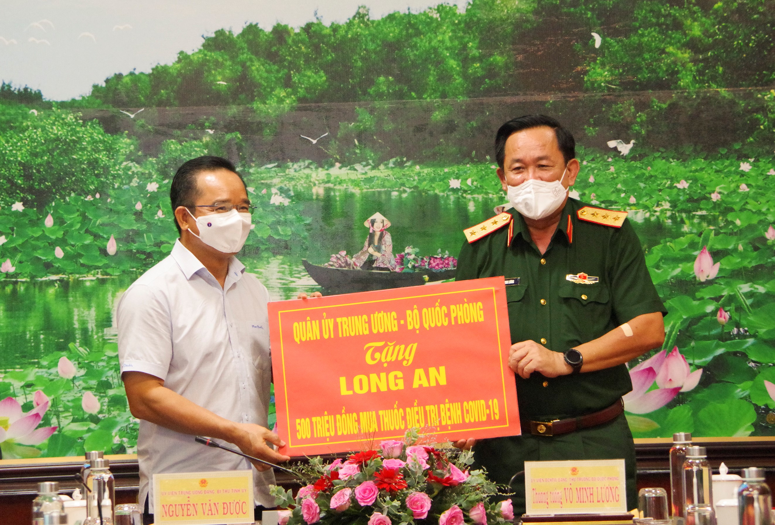 Dịp này, Quân ủy Trung ương, Bộ Quốc phòng trao tặng Long An 500 triệu đồng mua thuốc điều trị Covid - 19 và 5 tấn lương khô hỗ trợ người dân gặp khó khăn trên địa bàn tỉnh.